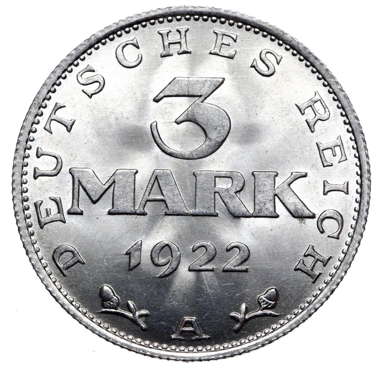 Німеччина - Веймар - монета - 3 марки 1922 A - БЕЗ ІНСТРУКЦІЇ Стан монетного двору UNC 2