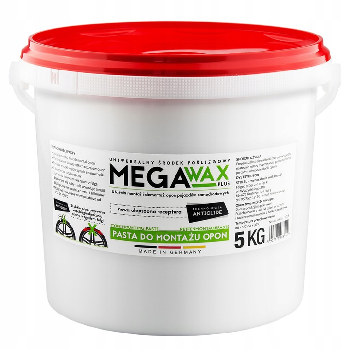 MEGA WAX Plus — це універсальне мастило, яке ідеально підходить для монтажу та демонтажу шин. Завдяки можливості використання в широкому діапазоні температур від -5°C до +50°C ця паста гарантує легкий і швидкий монтаж шини на ободі, захищаючи її під час експлуатації. Використання цієї пасти мінімізує ризик пошкодження борта шини.