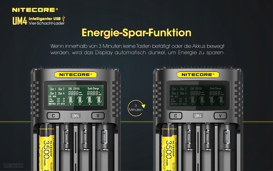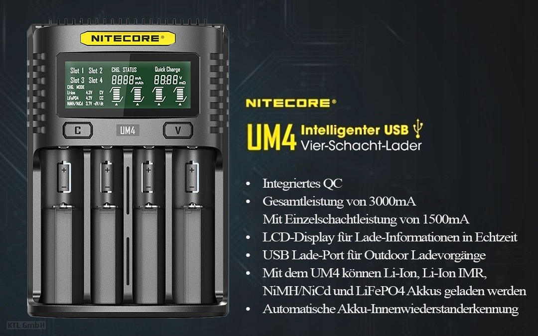 Nitecore відмовився від інтегрованого джерела живлення в UM4 і інтегрував * QC 2.0 (швидка зарядка) із зарядним пристроєм на вході USB. Заряджання акумуляторів довжиною 77 мм, наприклад: захищені акумулятори 20700/21700, автоматичне визначення внутрішнього опору акумулятора, розрахунок зарядженої ємності та повторна активація літій-іонного акумулятора є іншими корисними доповненнями.