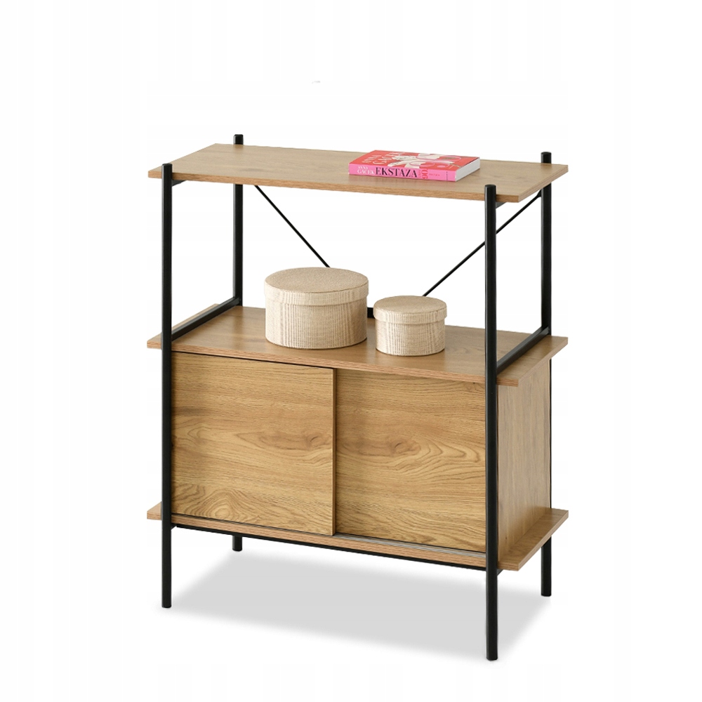 Низька полиця ALMA A з шафою - ідеальне рішення для сучасних і промислових інтер'єрів. Він чудово підійде у вітальні, офісі чи залі, пропонуючи відкриту полицю для прикрас і закриту шафу для дрібниць. Завдяки компактним розмірам він практичний навіть у невеликих приміщеннях.