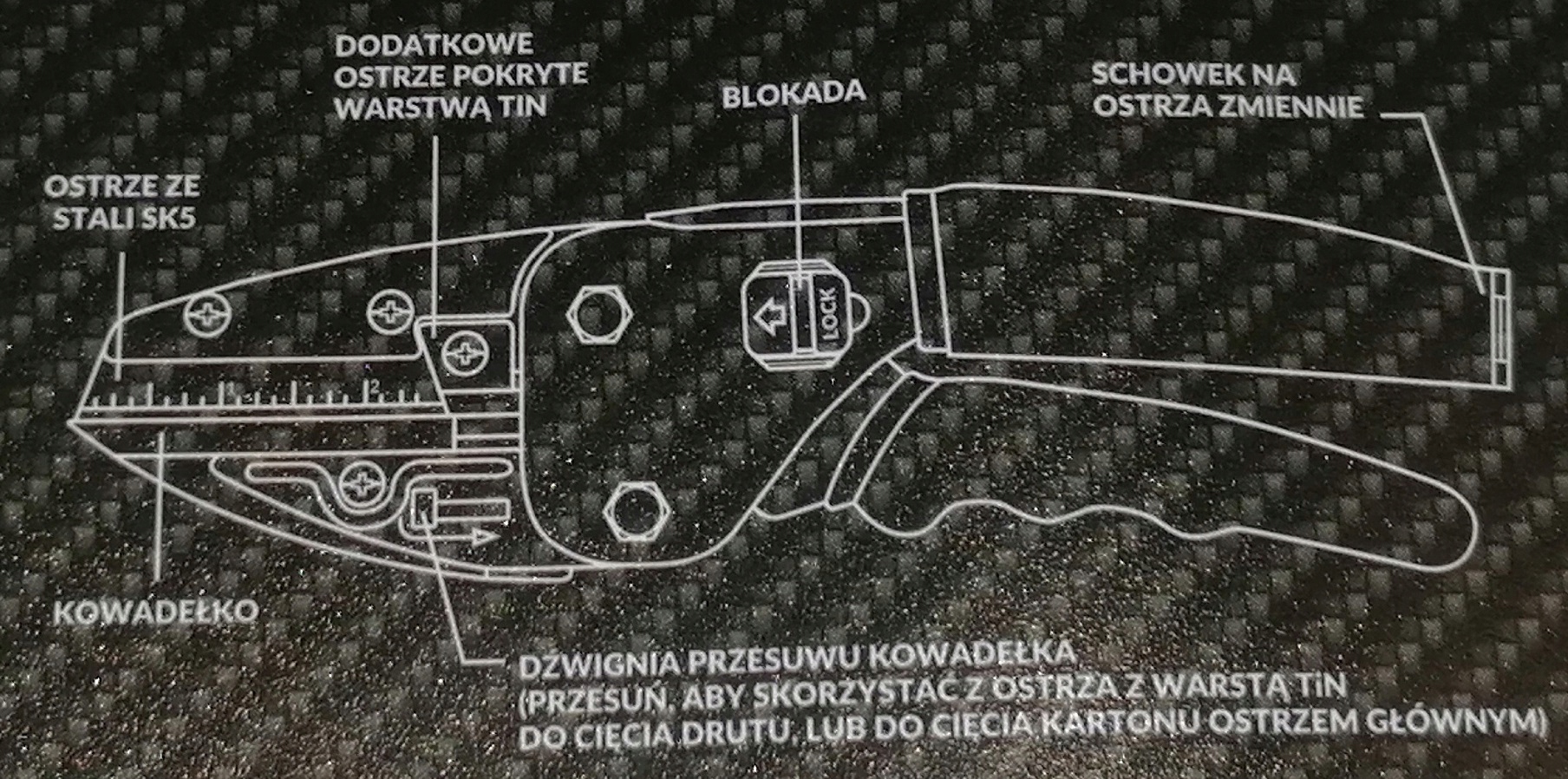 Чудовим рішенням, що використовується в ножицях, є рухоме ковадло зі сплаву цинку, яке, коли його витягти, розкриває лезо, перетворюючи ножиці на міцний технічний ніж.