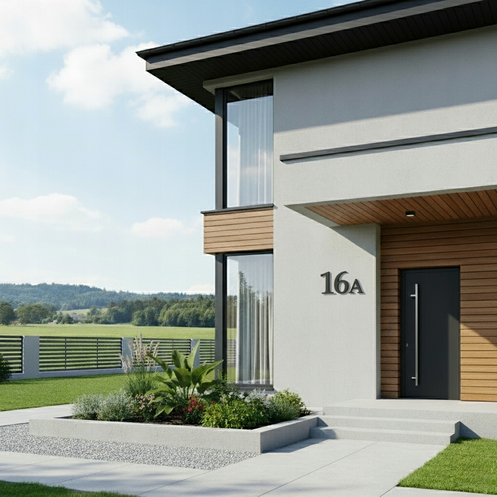 Він не тільки виглядає естетично - число "піднімається" над стіною завдяки відстані 18 мм, але також повністю стійкий до погодних умов .