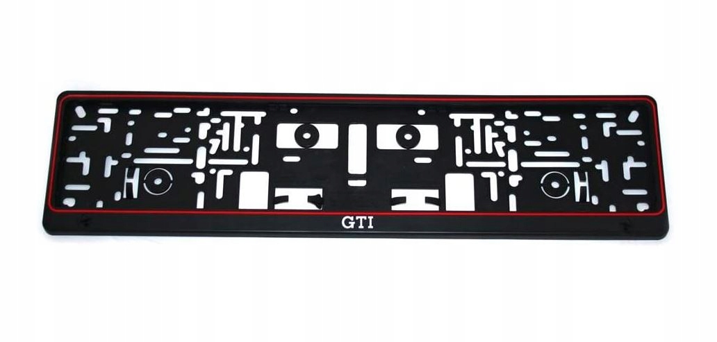 Пластиковий тримач номерного знака з написом GTI та червоними смугами. Конструкція (проста) дозволяє легко встановлювати як рамки. Інструмент для фіксації кожного тримача номерного знака попередньо перфорований (сформований на звороті). Підходить для: однорядної європейської таблички 520x110 мм.