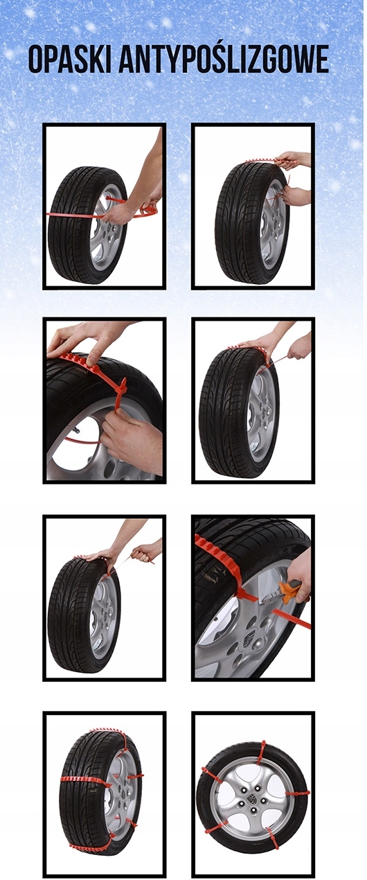 не -слизні смуги, виготовлені з високоякісного пластику, є чудовою альтернативою снігових ланцюгах у аварійних ланцюгах. Не -Slip присвячений алюмінієвим ободам. Їх можна використовувати для коліс до 22 дюймів.