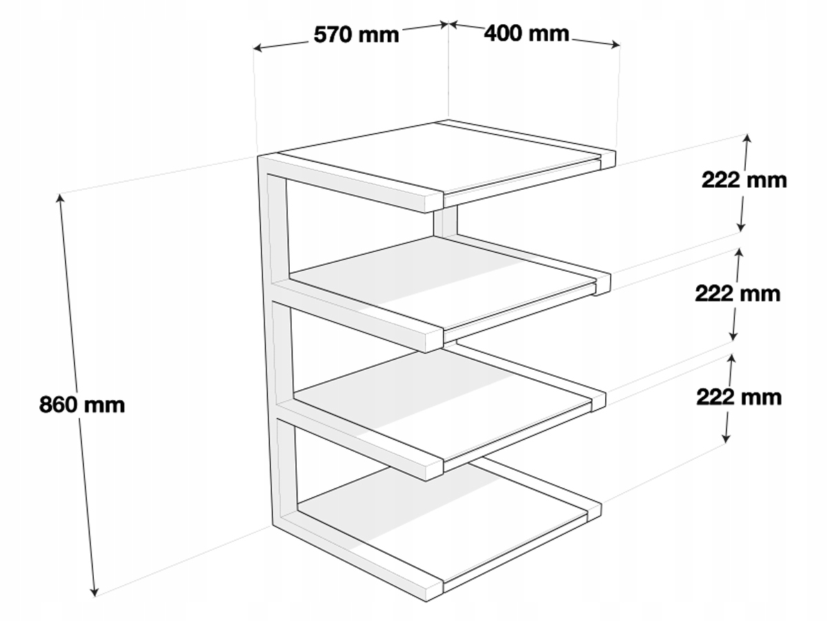 Спеціально розроблена конструкція таблиці дозволяє завантажуватись на суму, як 40 кг на верхній полиці та після 20 кг інші три полиці. Рама була виготовлена зі сталі, , а полки, виготовлені із загартованого скла . Він може легко носити практично будь -яке аудіопартамент, а верхня полиця також може бути використана як основа для телевізора.