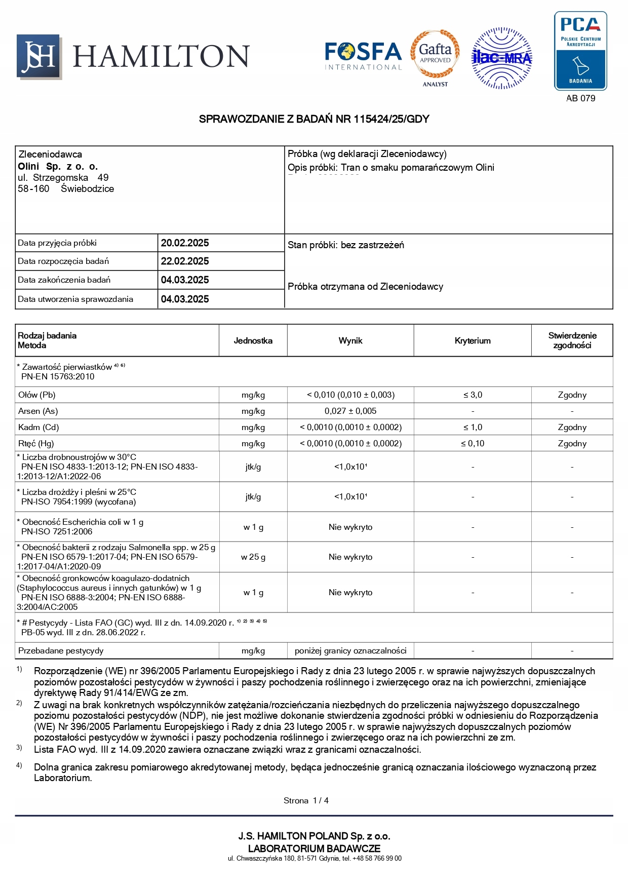 приручений з натуральним апельсиновим ароматом olini - свіжою печінковою олією Атлантичної тріски, без забруднюючих речовин, низький тоток - 10,3, відповідає стандартам безпеки та стандартам