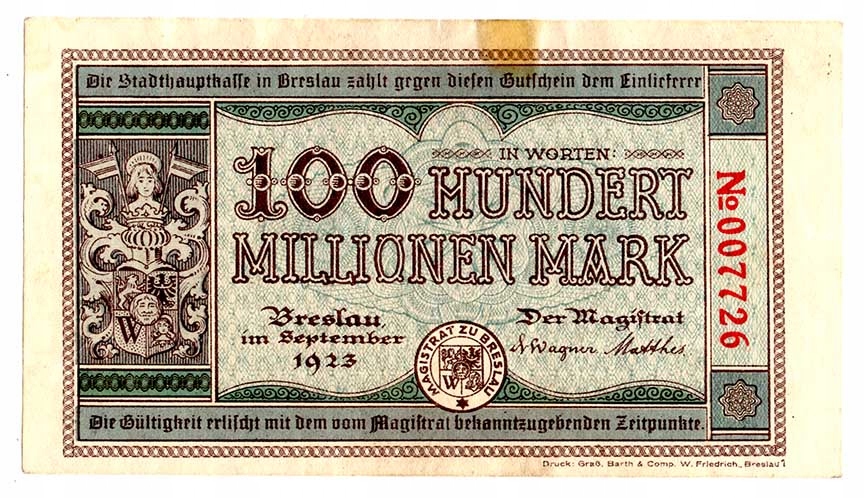 notgeld Wrocław Breslau 100 Mln Mk 1923