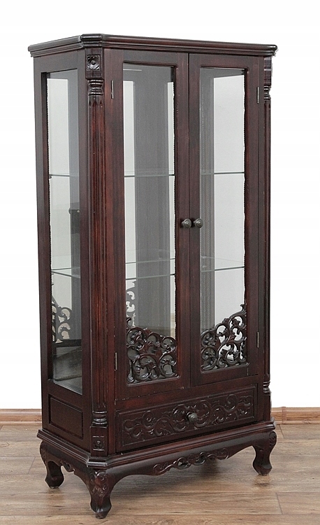 Елегантна та класична вітрина з екзотичної деревини кольору темного червоного дерева є надзвичайно чарівною частиною меблі, які додадуть характеру вашому інтер'єру. Вітрина з двома полицями та шухлядою вражає своїми витонченими різьбленими деталями, додаючи неповторного шарму будь-якій кімнаті. Ідеальна пропозиція для тих, хто цінує елегантність і вишуканий стиль у своєму домі.