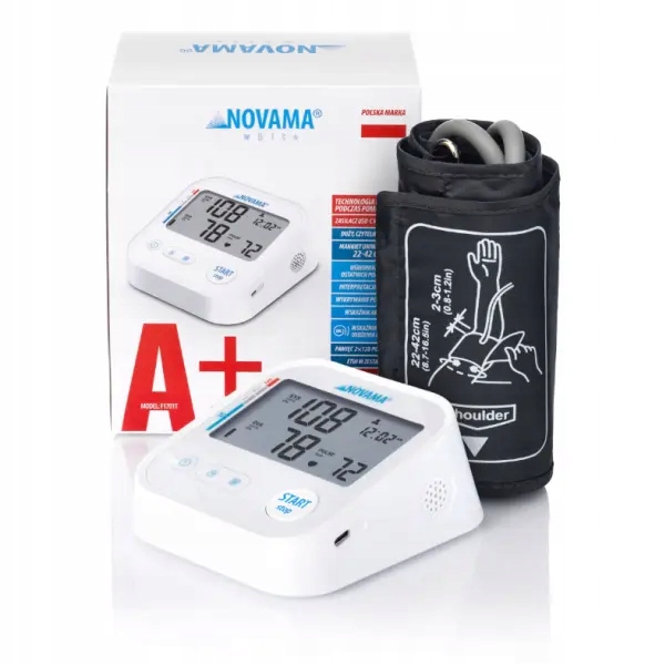 Монітор артеріального тиску надзвичайно міцний і твердий. Крім того, автоматичне вимкнення допомагає заощадити енергію, а відображення дати та годин дозволяє легко відстежувати результати. Novama White A+ також оснащений голосовою функцією в польській мові, що особливо корисно для людей з візуальними обмеженнями або запобігання словесним повідомленням.