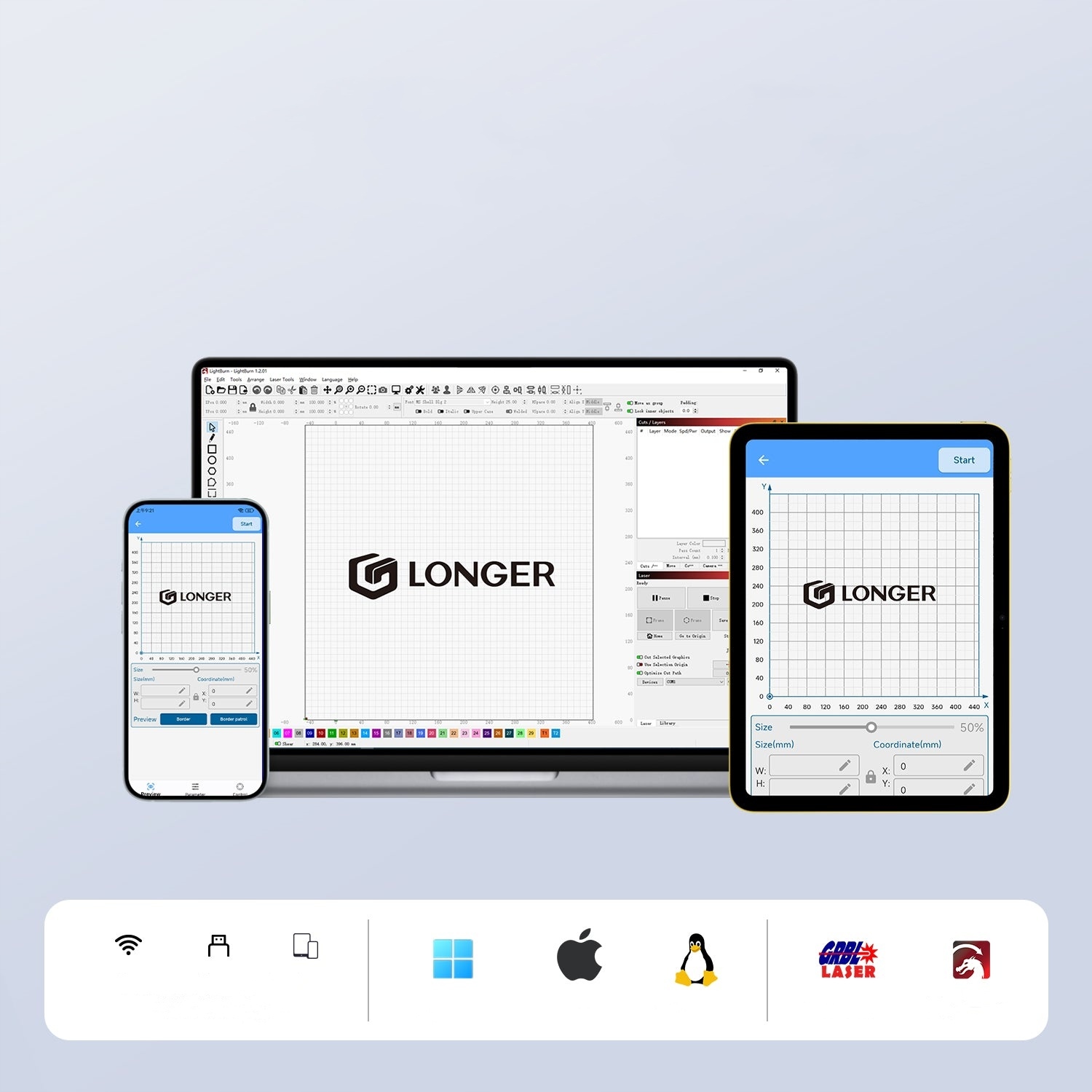 Серія Longer Nano легко інтегрується у ваш процес проектування завдяки широкій сумісності та підтримці двох стандартних програмних рішень, Lightburn і LaserGrbl.