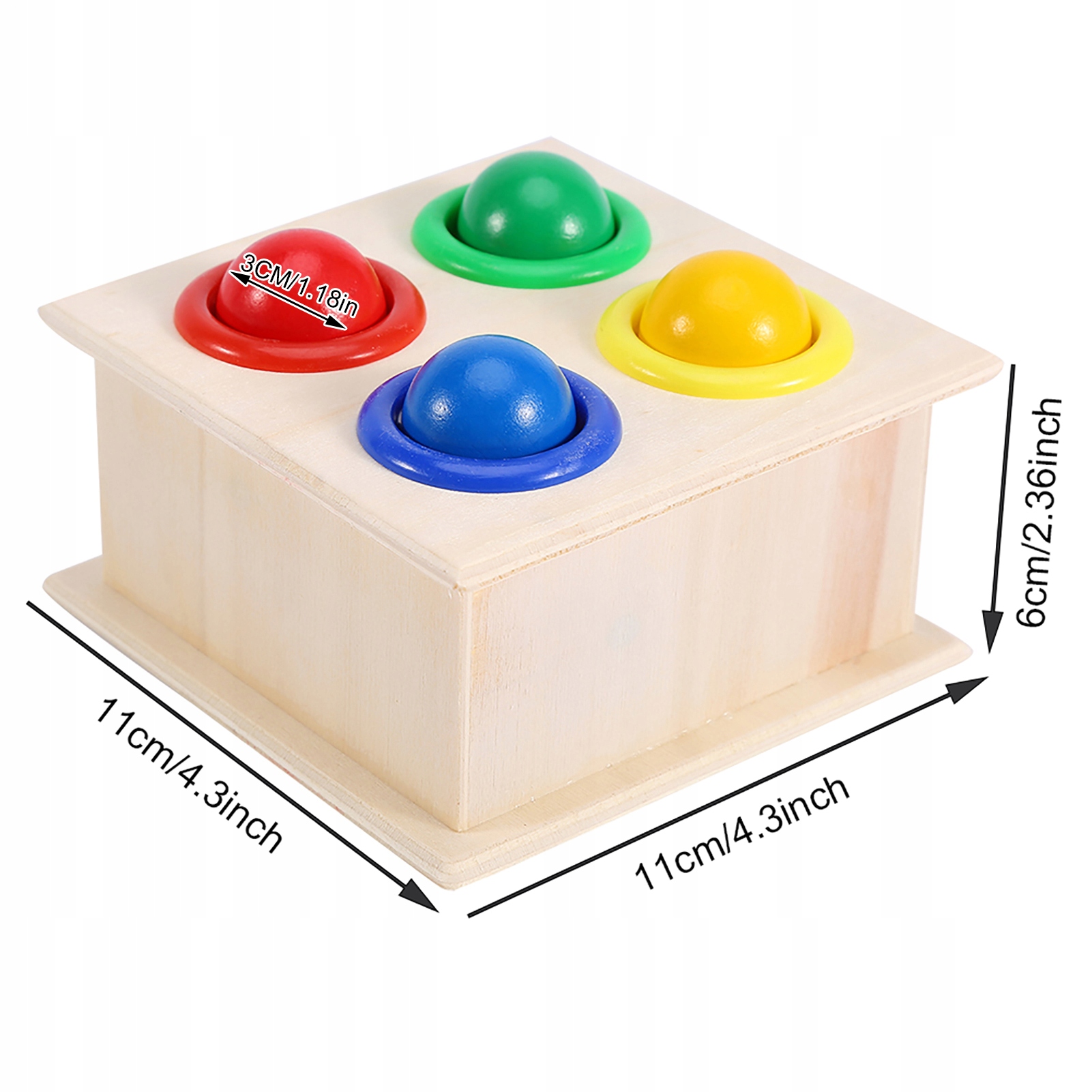 4. Цей виріб являє собою тверду дерев’яну полицю з чотирма отворами розміром з м’яч і чотирма кольоровими кульками, а також молотком для ударів по м’ячу, що робить його міцним.