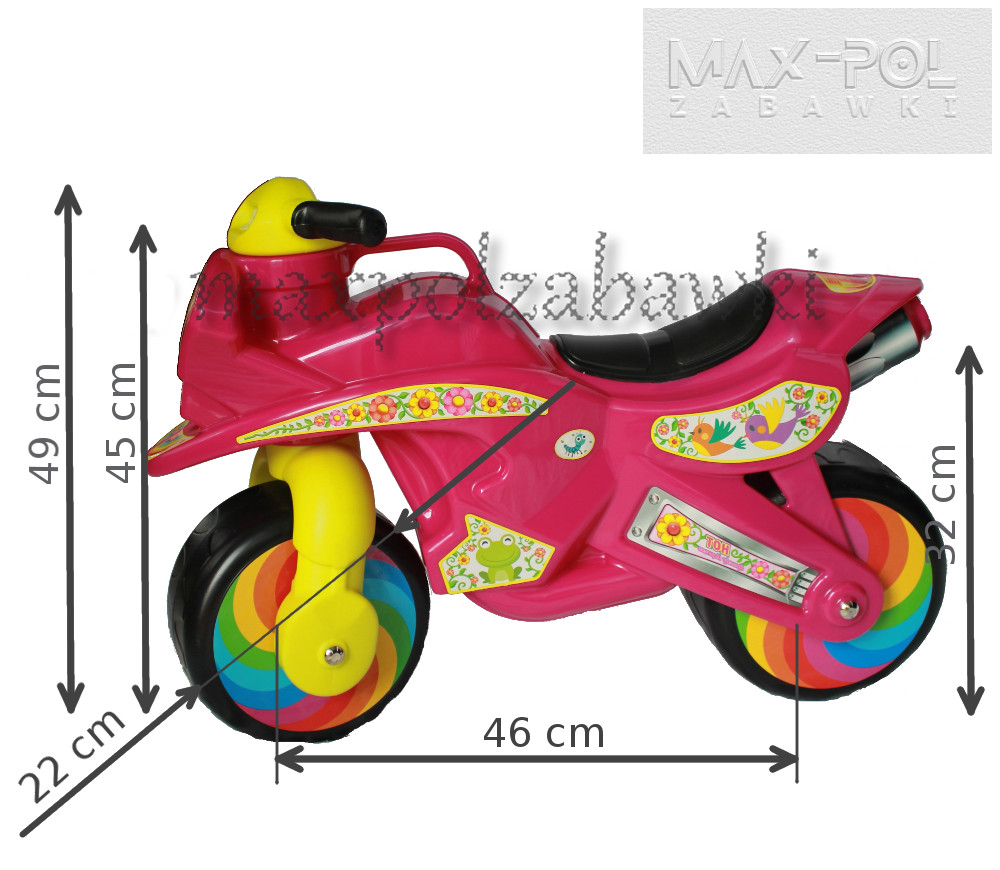 Новий дизайн спеціально для дівчат. На барвистих наліпках зображені метелики, сонечка, равлики, жаби, квіти - кожен катер знайде щось для себе. Райдужні наклейки на колеса створюють бурю фарб під час руху. Завдяки цікавим кольорам (кузов єпископської троянди) мотоцикл зацікавить найменших дітей.
