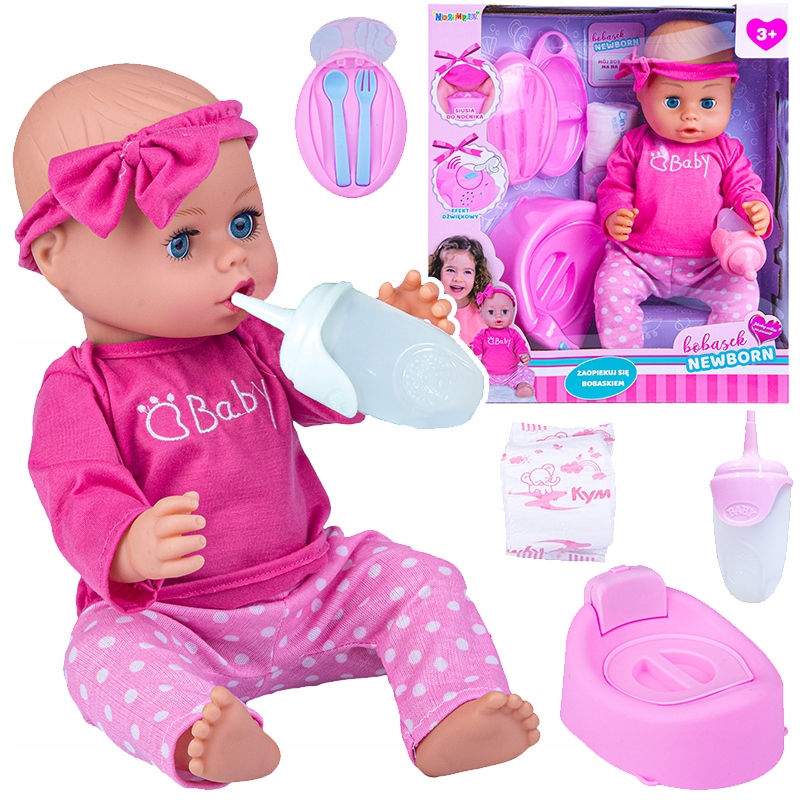 Унікальна лялька, яка п'є та пісяє. Подбайте про свою дитину, погодуйте її та змініть підгузки. Зріст малюка 43 см! На голові красивий рожевий бантик. Дитина одягнена в рожеву піжаму, що складається з двох частин - блуза і шорти в горошок. Лялька має рухомі руки, ноги та голову. Ідеально підходить для купання. Коли дитина лежить, її очі закриваються.