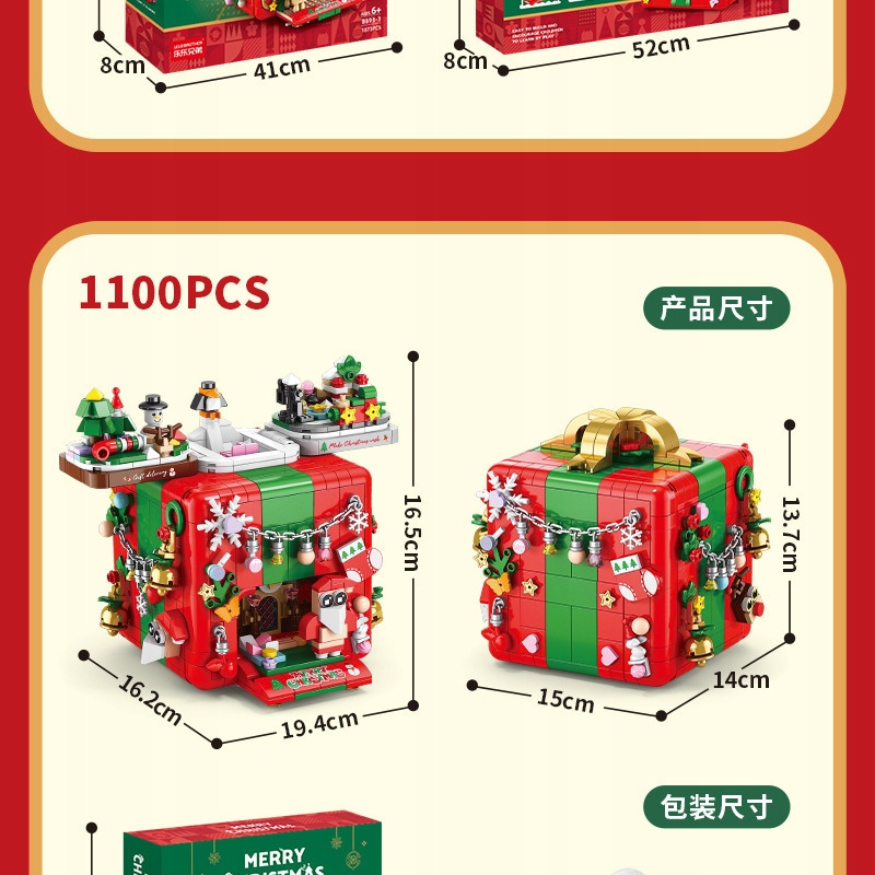 Це блокова іграшка-головоломка, наповнена різдвяною атмосферою, спеціально розроблена для Різдва, сумісна з великими брендами будівельних блоків і може бути підключена до великих брендів будівельних блоків без будь-яких проблем. Завдяки темі класичних різдвяних елементів, таких як Санта-Клаус, різдвяна ялинка та сніговик, у поєднанні з дизайном механізму та інтерактивним ігровим процесом, він може не лише розвивати практичні здібності дітей та здатність до логічного мислення, але й привнести сильну різдвяну атмосферу в сім’ю, що є різдвяним подарунком для хлопчиків і дівчаток.