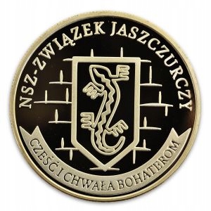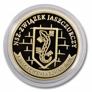 Перша в історії нумізматична монета на честь героїв-вояків під прапором: NSZ-ZWIEK JASZCZURCZY, польської військової організації національного табору, створеної в травні 1944 року, зараз у продажу. Ця вкрита золотом монета підписана Corona Regni Poloniae. На його реверсі ми розмістили символ Lizard Association у стилі муралу. Під «Ящіркою» декоративна стрічка з написом: ГЕРОЯМ ЧЕСТЬ І СЛАВА! Кожна монета поміщена в прозорий ковпачок та ілюстрований блістер, невід’ємною частиною якого є авторизуюча голограма, що містить індивідуальний нумізматичний номер.