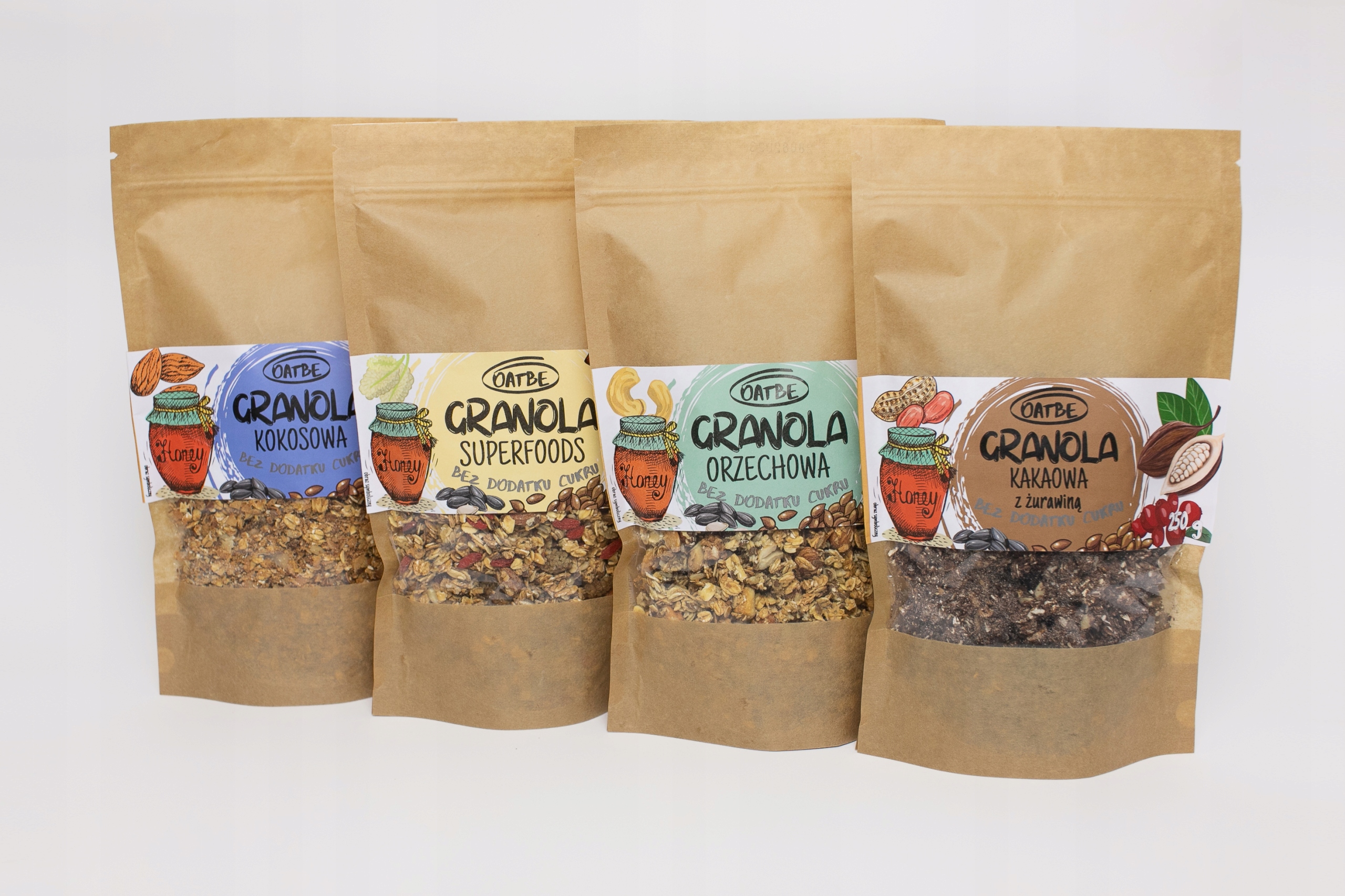 Гранола — це суміш цільнозернових вівсяних пластівців і смачних натуральних добавок. Своїм солодким смаком він завдячує додаванню польського натурального багатоквіткового меду. Усі ці інгредієнти з’єднуються, а потім запікаються, завдяки чому виходить хрустка консистенція.