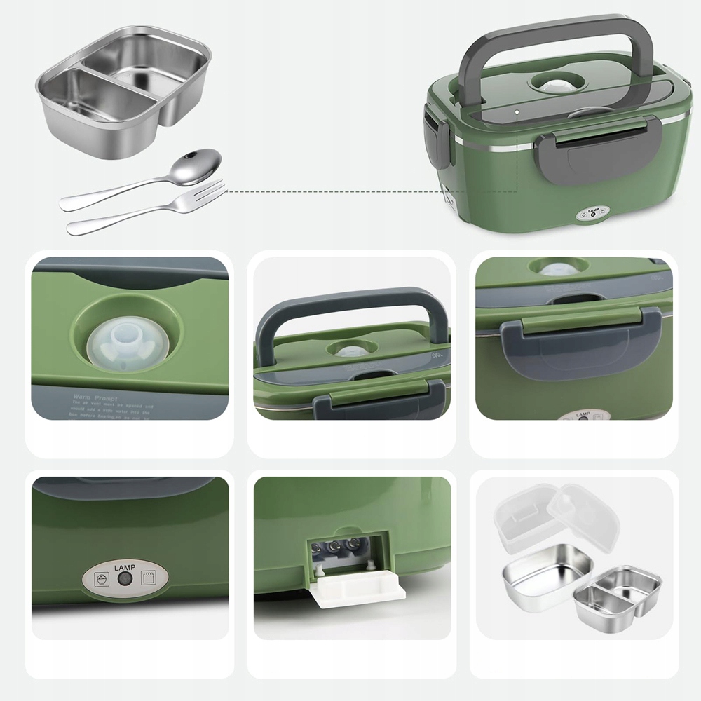 elektryczny Lunchbox 1,5 L 60 W + 2 x Lunchboxy Ze Stali Nierdzewnej 304 + torba na Lunchbox + Wyjmowany Lunchbox + sztućcce + 2 x gąbki czyszczące Zielony Wojskowy
