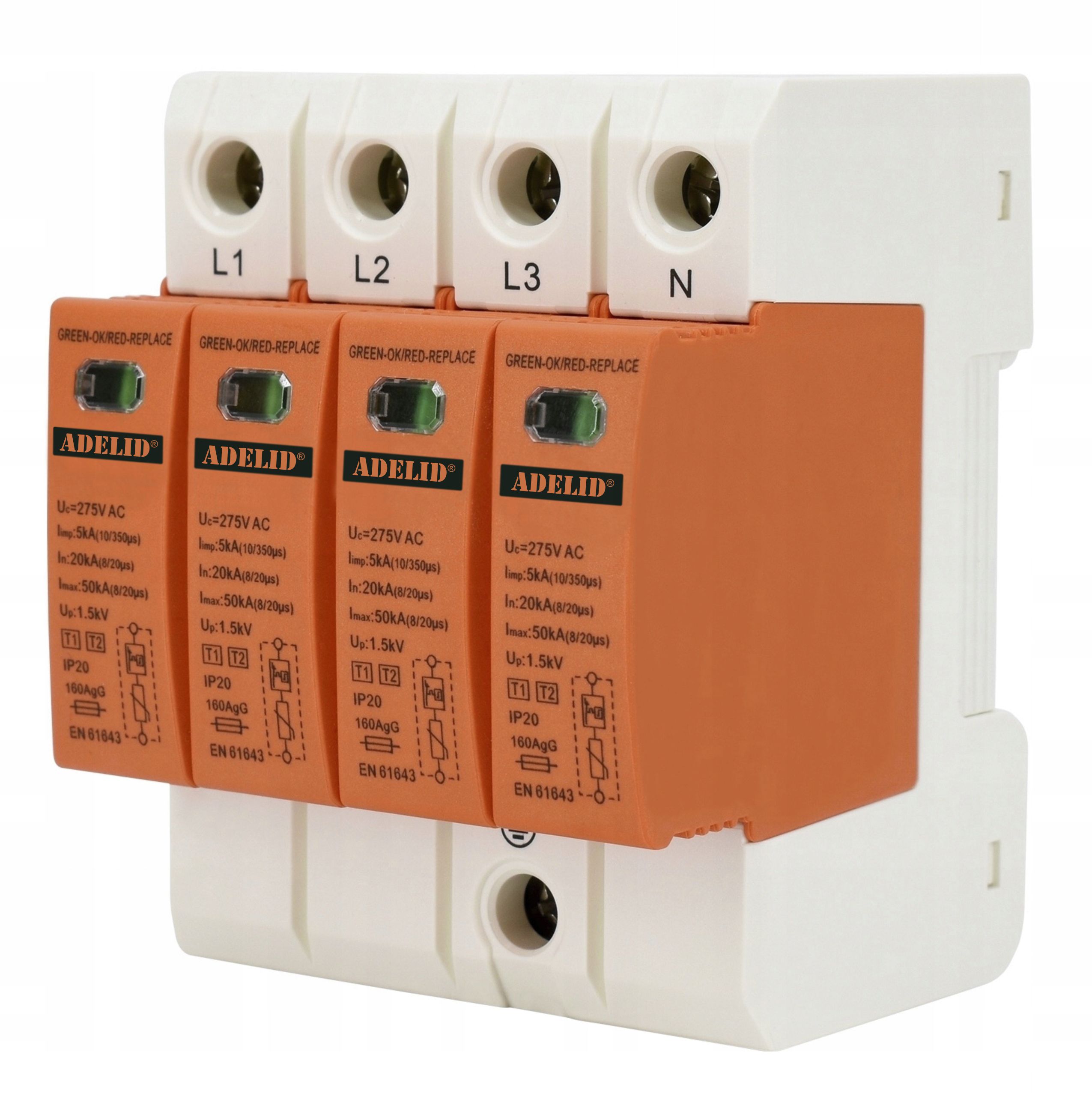 ОБМЕЖУВАЧ ЗАХИСТУ ПЕРЕНАПРУГИ 3-ФАЗНИЙ B+C T1T2 4P 5kA