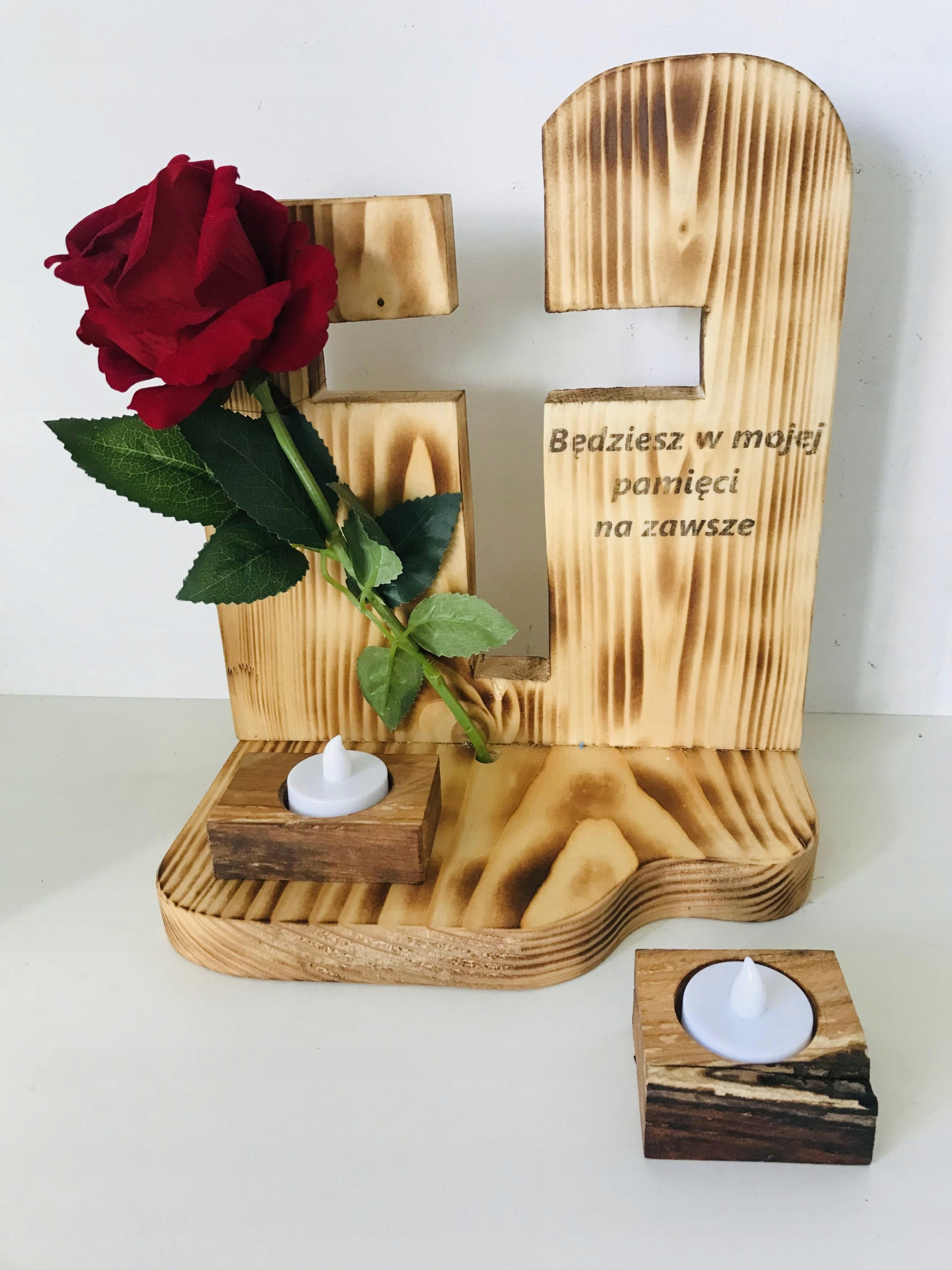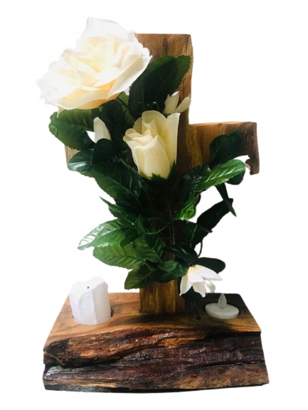 Дерев'яна надгробна композиція з трояндою та вигравіруваними вогнями - це продукт, створений від початку до кінця польським виробником.