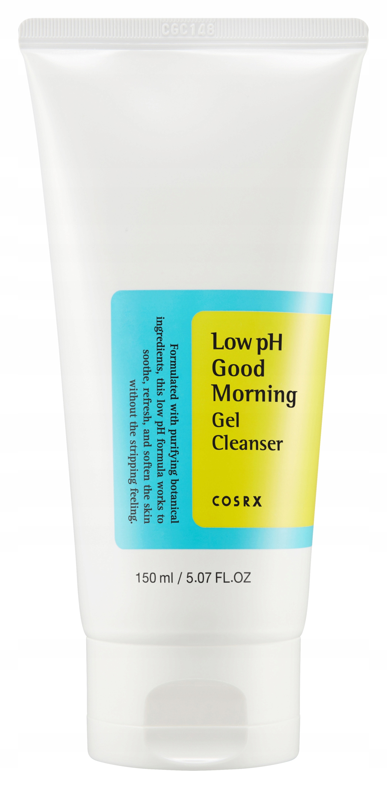 Low pH Good Morning Gel Cleanser від COSRX. Гель для обличчя. Ніжно вимиває шкіру обличчя, очищає пори від забруднень і видаляє надлишки шкірного сала, не створюючи неприємного відчуття стягнутості. Косметичний засіб має низький pH, тому не впливає на природний захисний бар'єр шкіри. Гель був збагачений, зокрема, олією чайного дерева, дріжджовим екстрактом, екстрактом квітки лотоса та алантоїном, що володіє протизморшковими, протизапальними, заспокійливими, зволожуючими та освітлюючими властивостями. При регулярному застосуванні регулює роботу сальних залоз, прискорює процес загоєння, має властивості проти акне. Гель випускається в тюбику 150 мл.