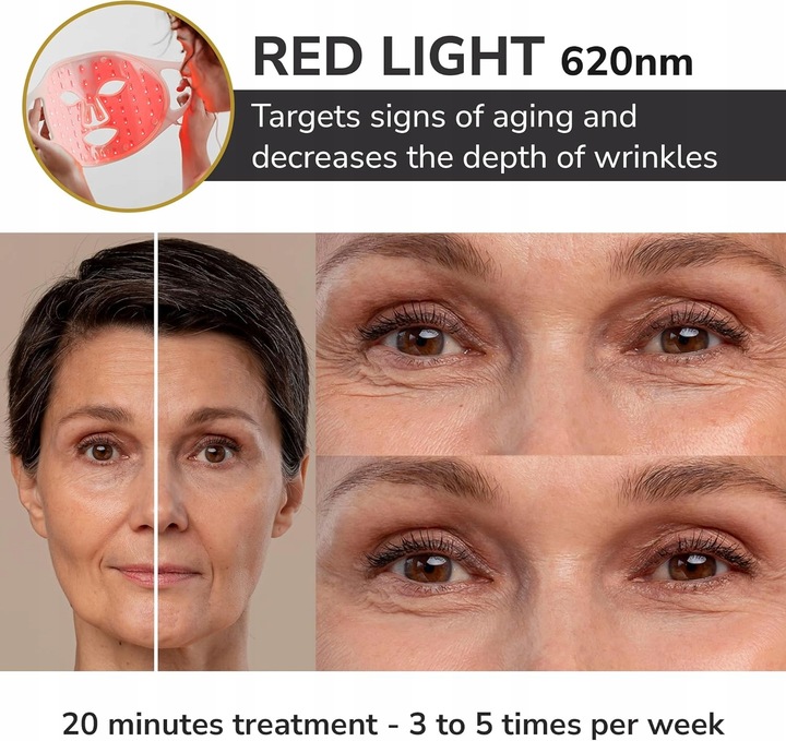 ТРИВАЛЬНИЙ ЕФЕКТ ЛИШЕ ПІСЛЯ 15 ХВИЛИН ЩОДЕННОГО ВИКОРИСТАННЯ Поєднання довжин хвиль, яке доведено як ефективніше: ближній інфрачервоний діапазон 850 нм, червоний 630 нм і синій 460 нм. Неінвазивний, безболісний, без побічних ефектів і підходить для всіх типів шкіри. Гнучкий силікон, який ідеально адаптується до контурів обличчя, забезпечуючи оптимальну експозицію та максимальний комфорт. Зручний і портативний. Пульт дистанційного керування з вбудованим акумулятором дозволяє використовувати його без необхідності підключати його до електричної розетки.