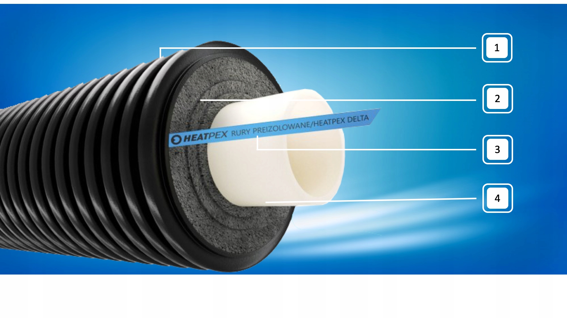 Високоефективний ізоляційний шар із хімічно зшитого пінополіетилену мінімізує втрати тепла під час передачі середовища. З цієї причини це рішення є проекологічним. Труби Дельта оснащені індивідуальним рішенням у вигляді маркера із зазначенням типу труби та виробника. Для труб Дельта ПЕ передбачена система підігріву трубопроводу, яка забезпечує захист від замерзання або підтримує потрібну температуру середовища.