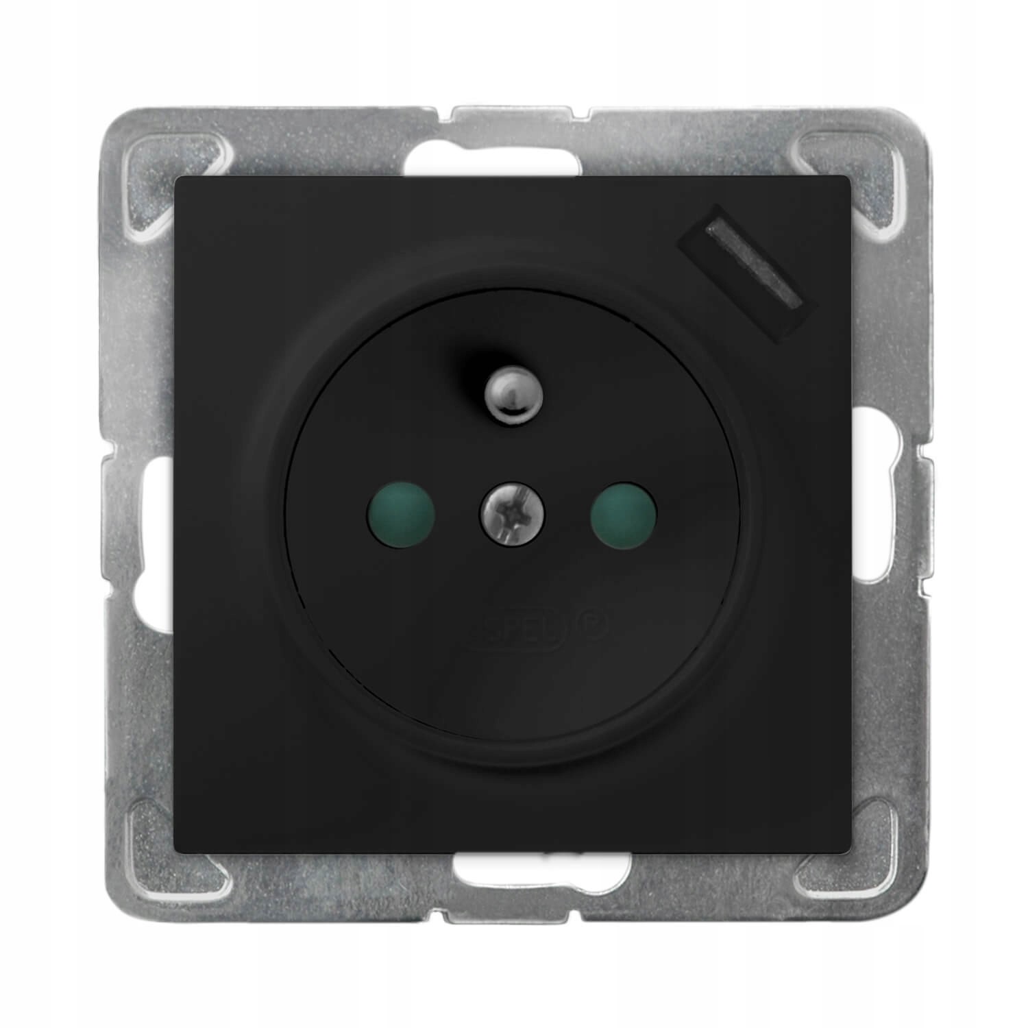 Електрична розетка із заземлюючим штифтом і USB-зарядним пристроєм, обладнана засувками для проходу струму. Для комплекту потрібна рамка. Можна використовувати для кількох рамкових систем.