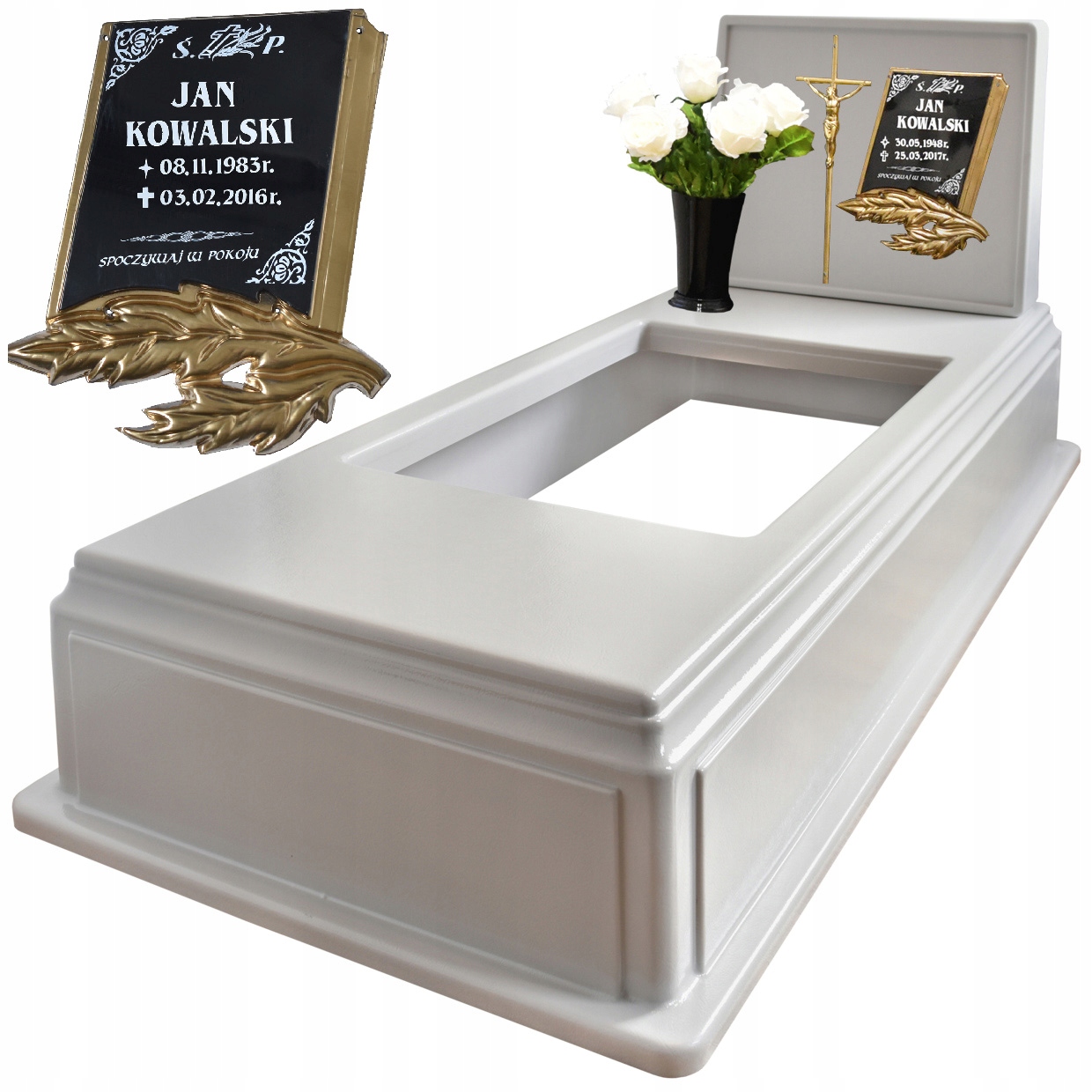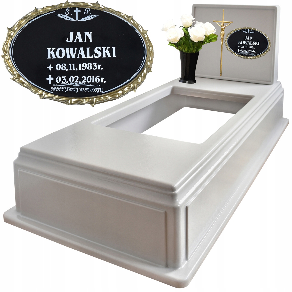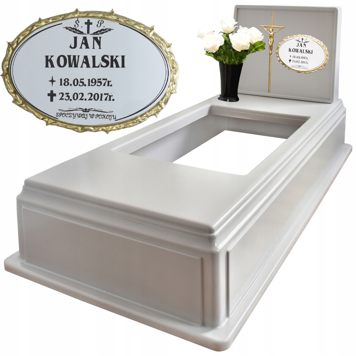 Пластмасовий цвинтарний пам'ятниквиконує функцію кам'яного надгробка. Це ідеальна альтернатива традиційному кам'яному пам'ятнику. Матеріал, з якого виготовлено виріб, характеризується високою стійкістю до погодних умов, УФ-променів, низьких температур і механічних пошкоджень.