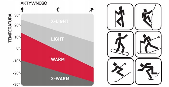 Одяг теплого сегменту, завдяки відмінній теплоізоляції, ідеально підходить для занять будь-якими видами активного відпочинку в холодну погоду. Захищає як від перегріву, так і від охолодження тіла. Тому він ідеально підійде для зимових видів спорту (катання на лижах, сноуборді, ковзанах), бігу, їзди на велосипеді, зимового туризму або повсякденної діяльності. Теплий одяг найкраще підходить за температури від +15 °C (при низькій фізичній активності) до -25 °C (при високій фізичній активності).
