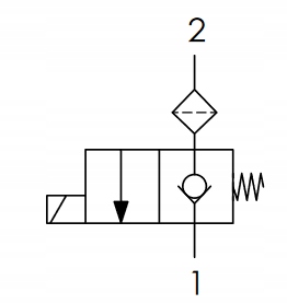 Вентиль без струму, нормально закритий з одного боку, в безструмовому режимі потік перекритий від 2 до 1, а вільний від 1 до 2. Після подачі струму потік вільний з одного боку від 2 до 1.