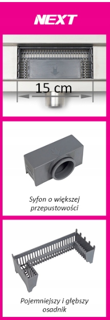 У лінійних дренажах серії NEXT сталева камера була збільшена порівняно зі зливом STANDARD, що дозволяє встановити ширший сифон. Це рішення збільшує пропускну здатність дренажу з 49 л/хв (СТАНДАРТ) до 55 л/хв (НАСТУПНИЙ). танк. Це означає меншу потребу в чищенні та покращує прохідність дренажу.