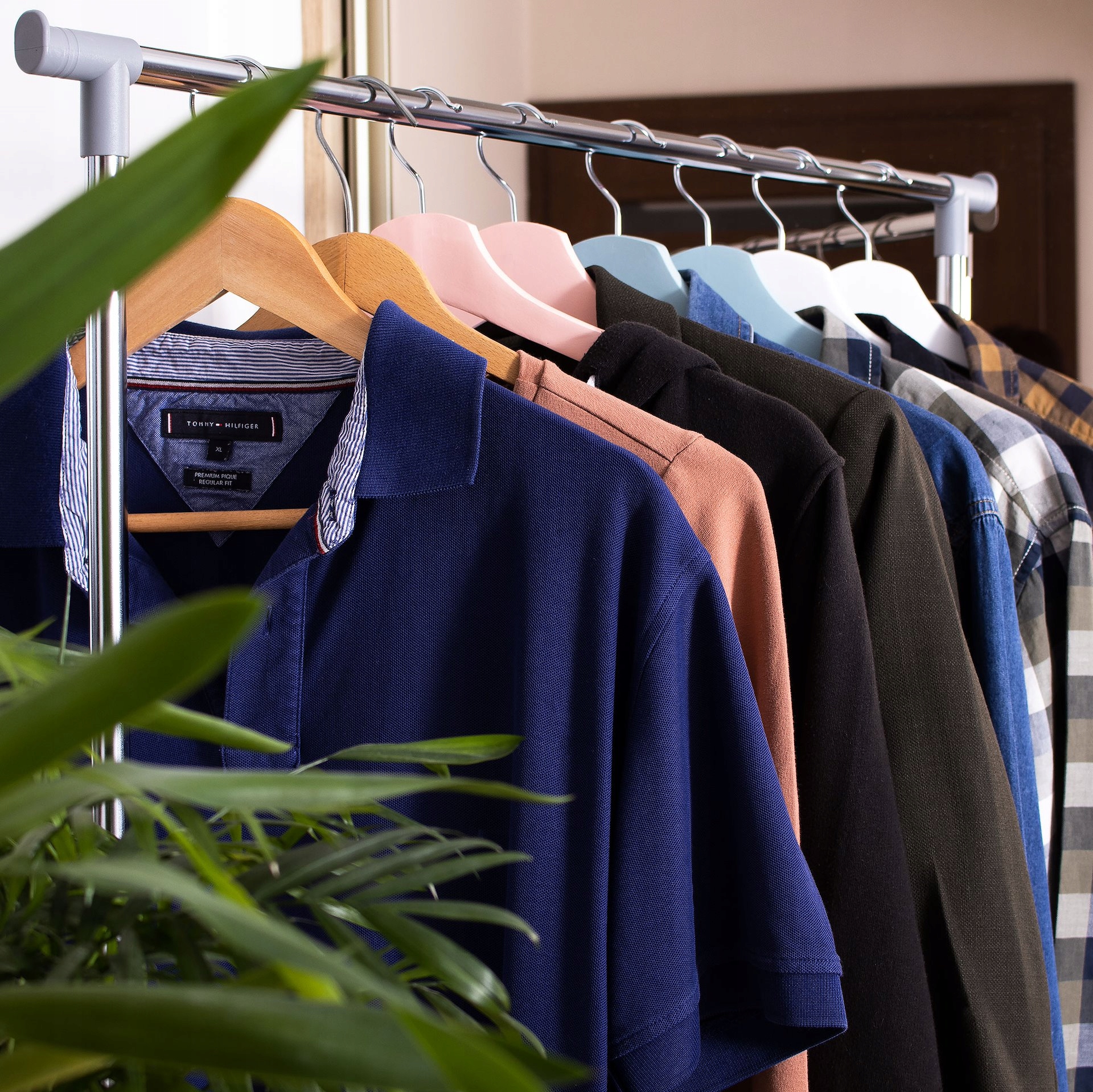 Стікова форма вішалки робить одяг стабільною прилипанням до її поверхні. Додатковою перевагою продукту є спеціальні відступи з боків, завдяки якому блузки, сорочки та сукні не ковзають . вішалка також має дерев’яний бар ідеально підходить для висячих штанів.