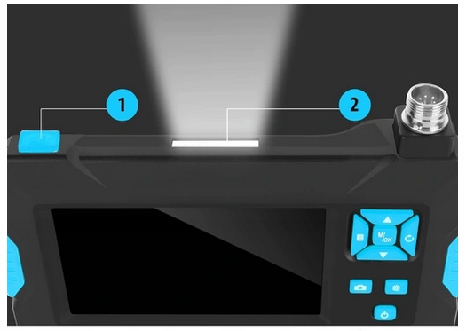 Камера має вбудовані 8 світлодіодів (основна камера) + 1 світлодіод (бічна камера), які освітлюють робочу зону ендоскоп. Світлодіоди мають регулювання яскравості, тому ми можемо уникнути переекспонування зображення та налаштувати потужність світлодіодів відповідно до ситуації.