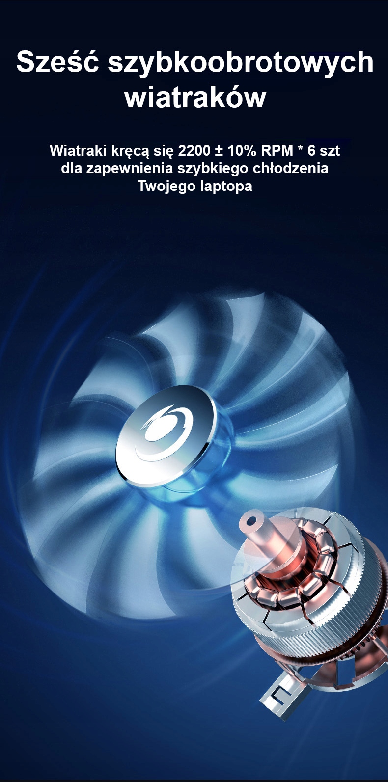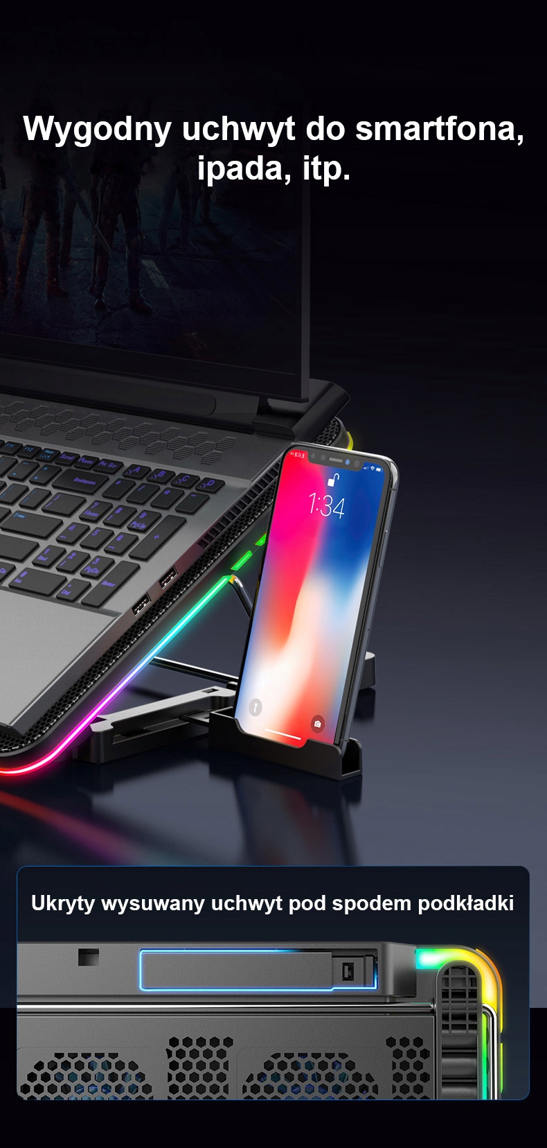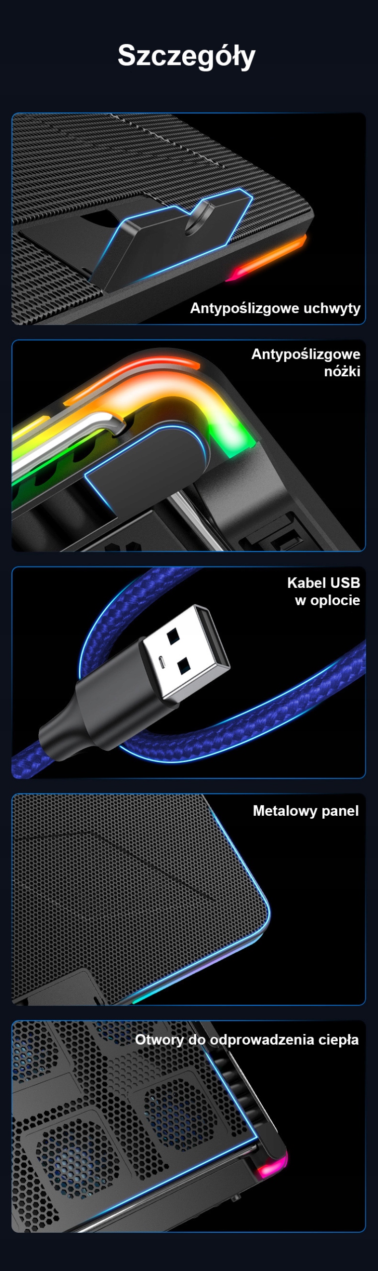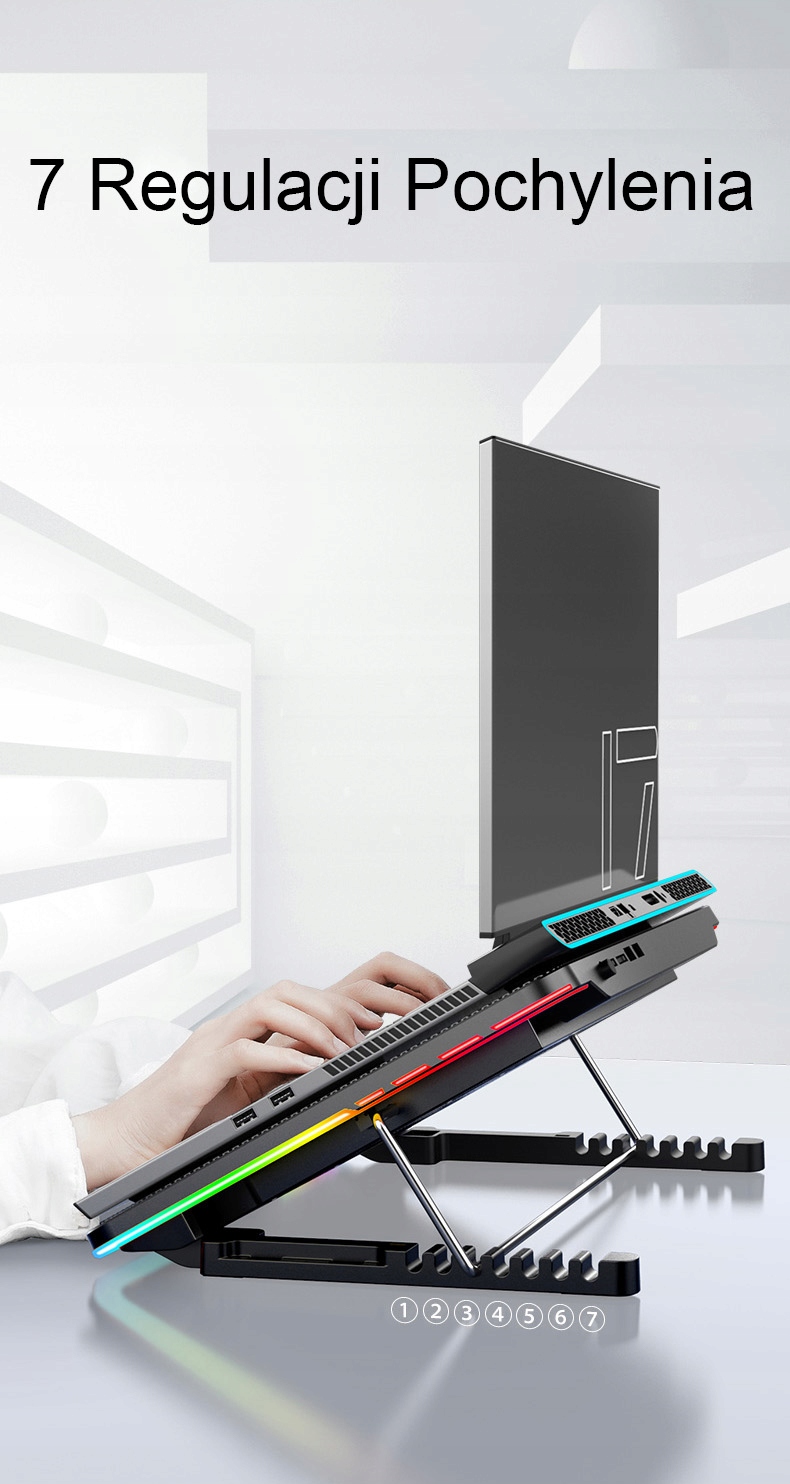 Підставка для ноутбука насамперед характеризується сучасним виглядом, стійкою конструкцією та ефективною системою вентиляторів із регульованою швидкістю. Розташування вентиляторів забезпечує ідеальне та ефективне охолодження ноутбука незалежно від розташування нагрівальних компонентів ноутбука (процесор, відеокарта, системи живлення, жорсткі диски). Широка сумісність з ноутбуками та ноутбуками з різними розмірами матриць 10, 12, 13, 14, 15,6, 16''. Конструкція дозволяє використовувати підставку на колінах. Гідравлічні підшипники працюють дуже тихо. Коли встановлено найнижчу швидкість вентилятора, шум практично не чутний. Нижня частина основи має додаткові ніжки, що збільшують кут нахилу для забезпечення максимальної ергономічності роботи.