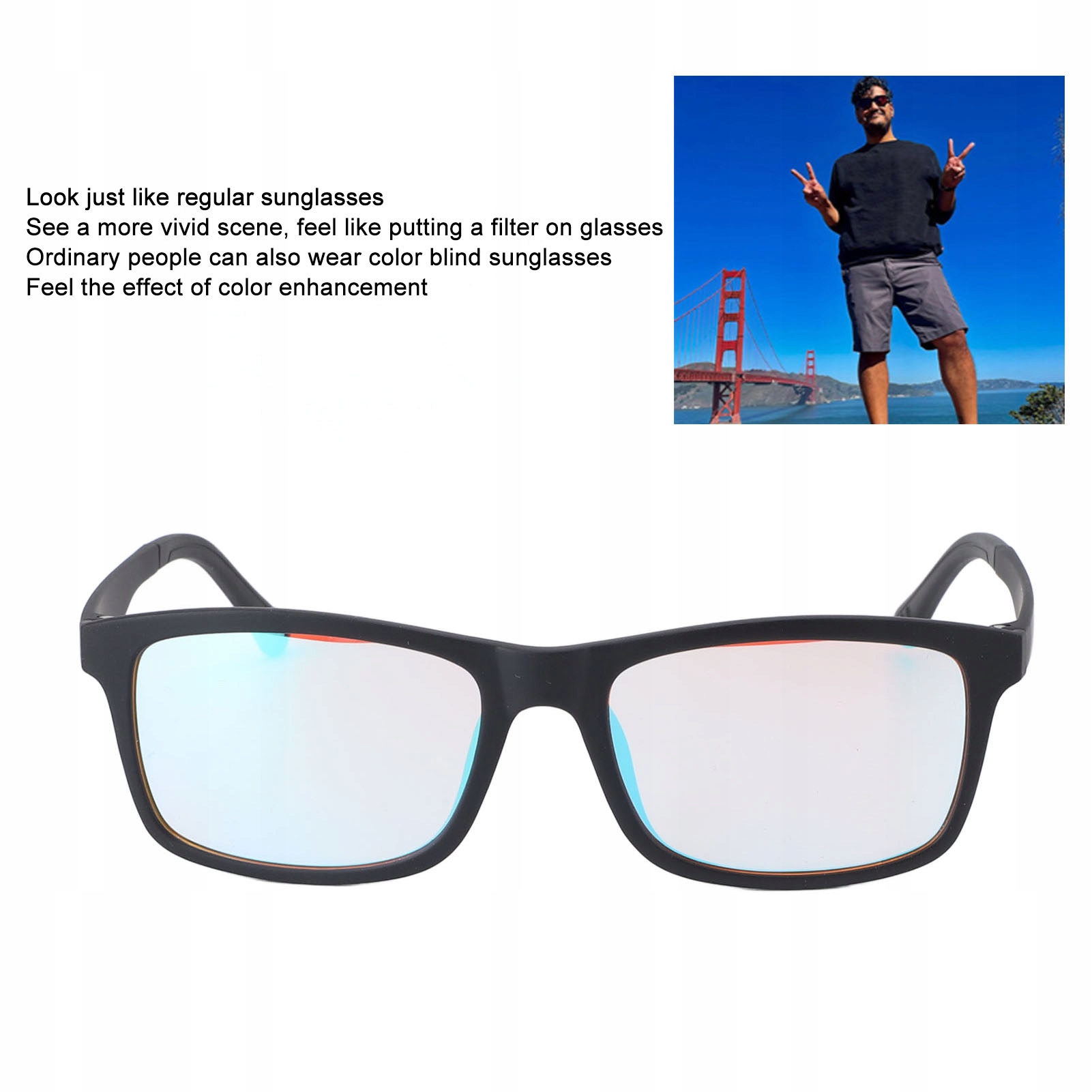 1. КОРЕКЦІЯ СВІТЛА: Ці окуляри для дальтонізму виглядають як звичайні сонцезахисні окуляри. Але після того, як його надівши, ви можете побачити більш яскраву картину, вам хочеться надіти фільтр на окуляри. Звичайні люди також можуть носити сонцезахисні окуляри для дальтоніків і можуть відчути ефект посилення кольору