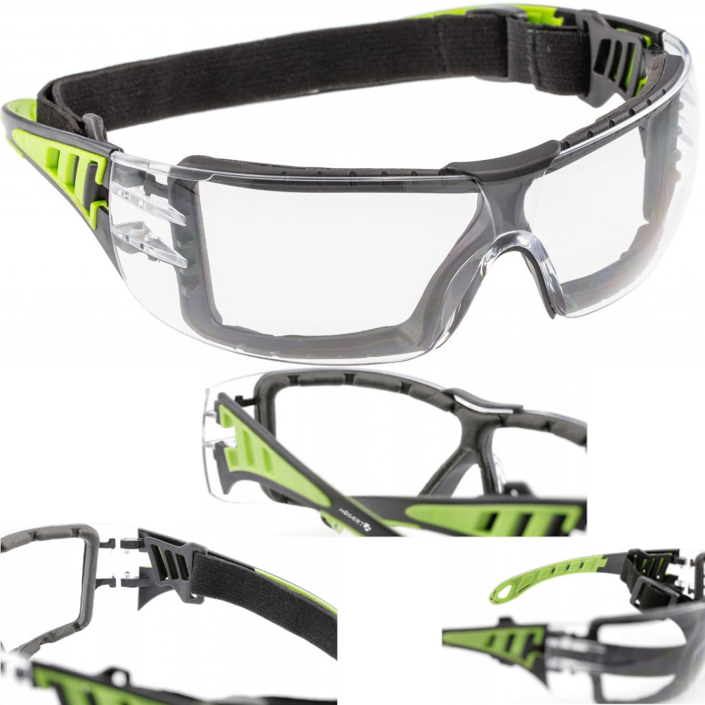 Лінзи окулярів виготовлені з безбарвного профільованого полікарбонату, завдяки чому забезпечують боковий захист ока та скроні. М'яка підкладка навколо лінз і знімний ремінець запобігають ковзанню і ковзанню окулярів. Руки виготовлені з полікарбонату, а дужки виготовлені з високоякісного матеріалу TPR (синтетично оптимізована гума). Крім того, кронштейни оснащені спеціальними вентиляційними каналами, які запобігають запотіванню лінз. Окуляри захищають від твердих часток низької енергії, що утворюються під час шліфування, свердління, різання, пиляння та дроблення. Вони ідеально підходять для типових робіт у промисловості та сфері послуг, будівництві, майстернях, лісництві, господарських та комунальних роботах. Не підходить для використання під час зварювання.