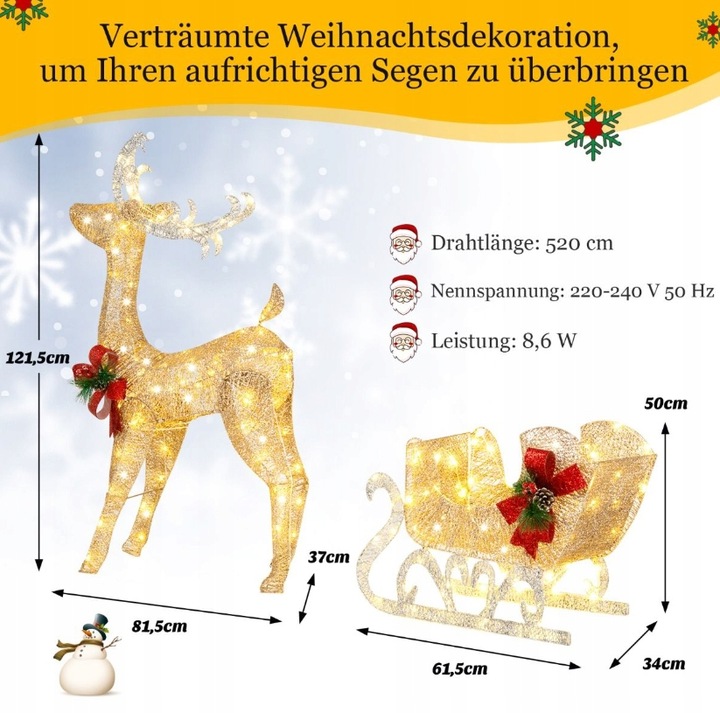 Привабливі різдвяні прикраси: , що складається з декоративних різдвяних саней та оленів з рогами, наші освітлені різдвяні прикраси виглядають більш яскравими та чарівними. Крім того, і сани, і реіндери оснащені червоним луком, прикрашеними класичними різдвяними есенціями, такими як червоні ягоди, соснові голки та соснові шишки, що допоможе вам відчути сильний святковий настрій.