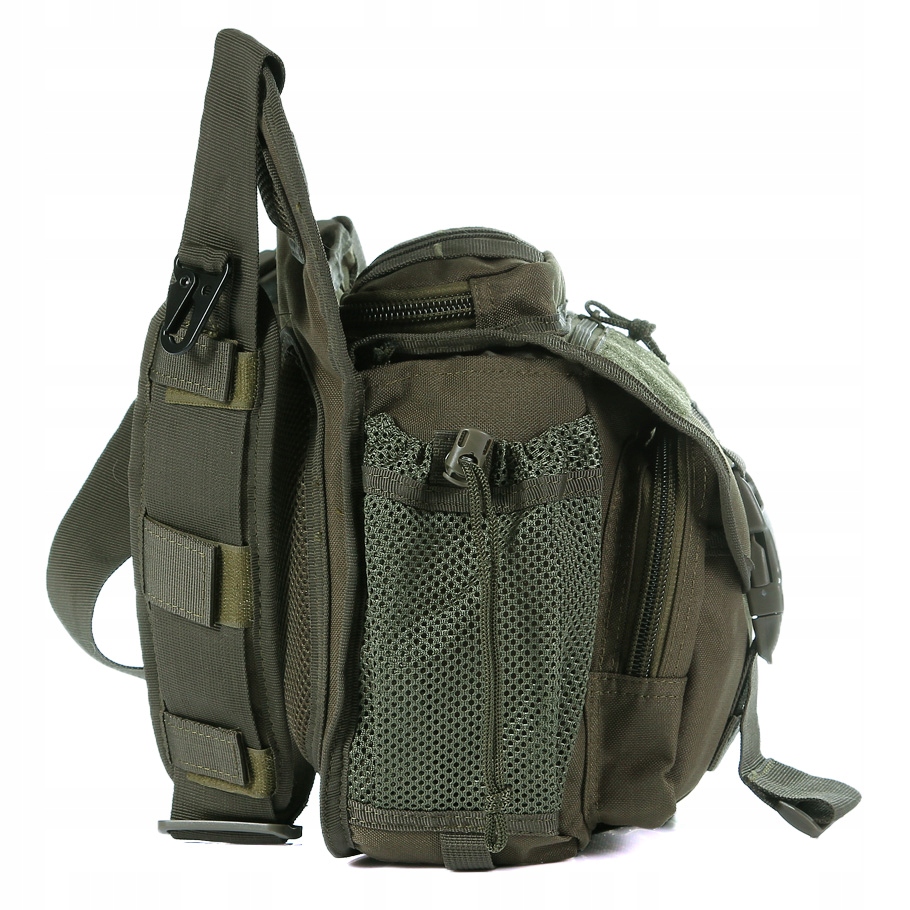 Всередині відділення є дві плоскі кишені Також є дві зовнішні кишені меншого розміру, що закриваються на блискавку (у верхній частині клапана та збоку), кишеня на пряжці для мобільного. телефон, сітчаста кишеня для літрової пляшки і три плоских кишені: одна на клапані, друга під ним і третя збоку. Крім того, ми можемо додати до сумки додаткові кишені в системі MOLLE завдяки ремінцям PALS для додаткового обладнання.