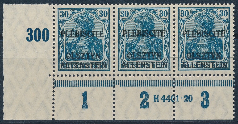 Olsztyn Plebiscite Post 1920 Germania. Випуск не введений в обіг. Горизонтальна стрічка номіналом 30 пфенігів із трьох марок із надрукованим номером HAN: "H 4401.20".