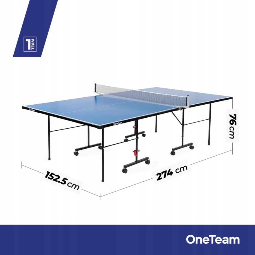 Стіл OneTeam має стандартні розміри 274 x 152,5 x 76 см, що забезпечує повну відповідність офіційним стандартам розмірів. Такий розмір столу дозволяє проводити професійні ігри, а також комфортно грати вдома. Це дозволяє гравцям насолоджуватися повноцінним досвідом гри в настільний теніс без компромісів.