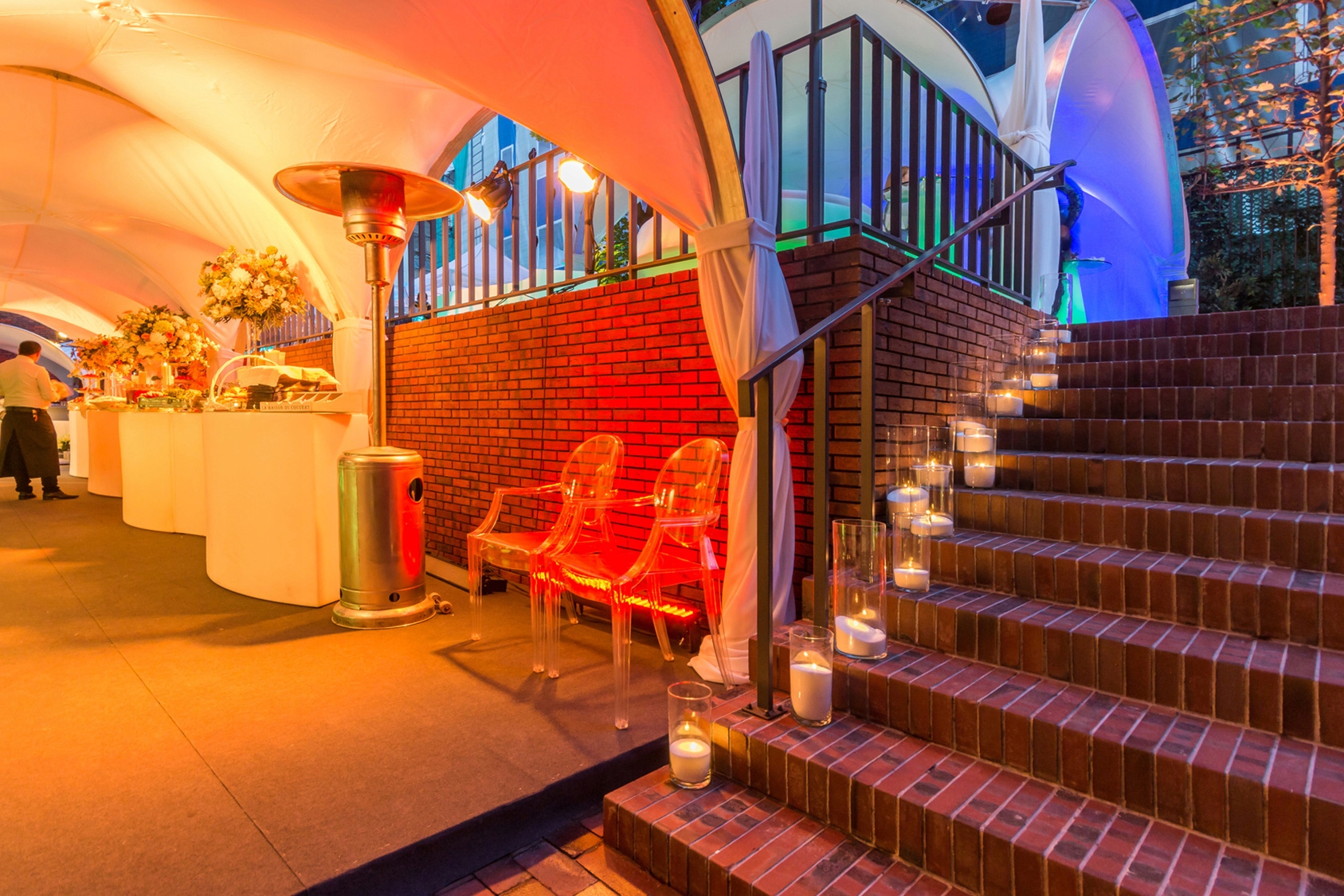 Закритий у сталевій чаші на самому кінчику пристрій дозволяє рівномірно і інтенсивно прогрівати зону навколо парасольки. Завдяки тому, що він розташований так високо, здалеку він виглядає елегантно, коли купол нагрівається червоним.