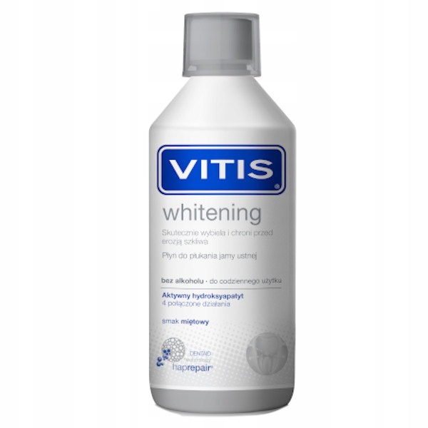 Відбілююча рідина для полоскання рота VITISпризначена для щоденного використання. Завдяки унікальній безалкогольній формулі ефективно відбілює зуби, повертає їм природну білизну і блиск, не пошкоджує емаль і запобігає підвищеній чутливості зубів. Ця унікальна формула заснована на революційній технології Dentaid nanorepair, тобто частинках гідроксиапатиту, які є невід'ємною частиною зуба. Відбілююча рідина VITIS доповнює дію зубної пасти, досягаючи важкодоступних місць і довше зберігаючи активні інгредієнти в роті.
