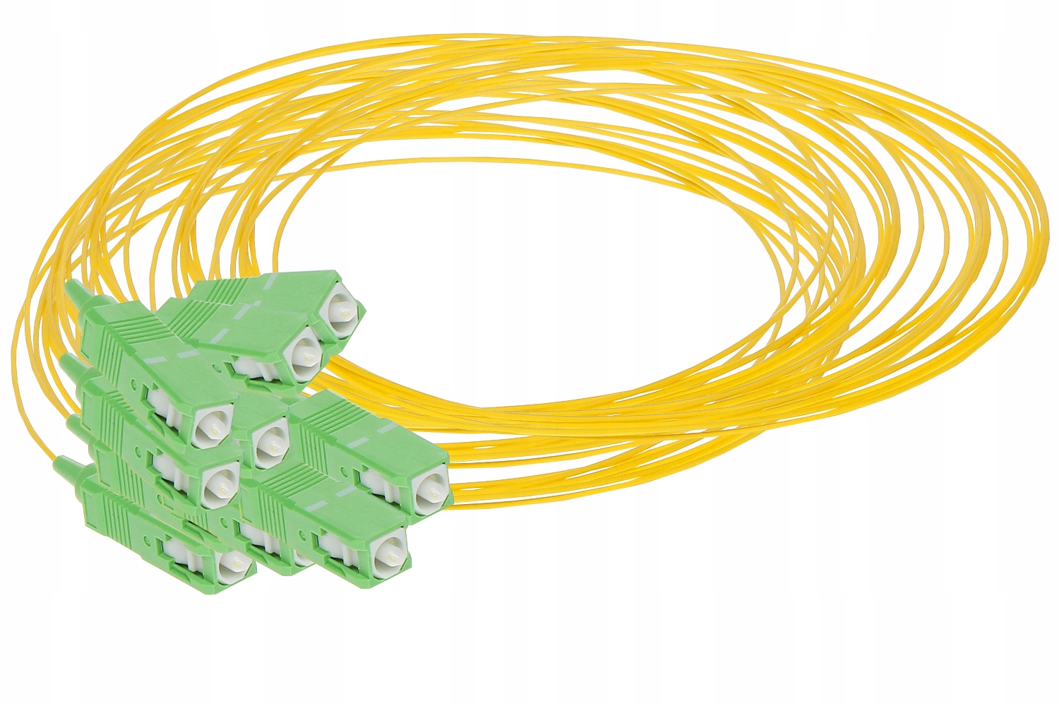 Волоконно-оптичний роз’єм призначений для з’єднання розподільних кабелів у розподільчих системах і завершується з одного боку з’єднувачем SC/APC, який має поліровану поверхню наконечника під кутом 8 градусів. Характеризується низьким загасанням і простотою монтажу та експлуатації оптичного волокна, а також високою швидкістю передачі даних. У пігтейлі використовується одномодове волокно G652D і зовнішня негорюча оболонка кабелю, яка не виділяє шкідливих газів (ЛСЖ) під час пожежі. Сигнал в одномодовому волокні не розсіюється, а потік даних передається паралельно осі і досягає кінця волокна в одній моді без відображень. Одномодове волоконно-оптичне волокно є ідеальним рішенням для оптоволоконного зв’язку на великі відстані, оскільки сигнал може передаватися без підсилення на відстань до 100 км.