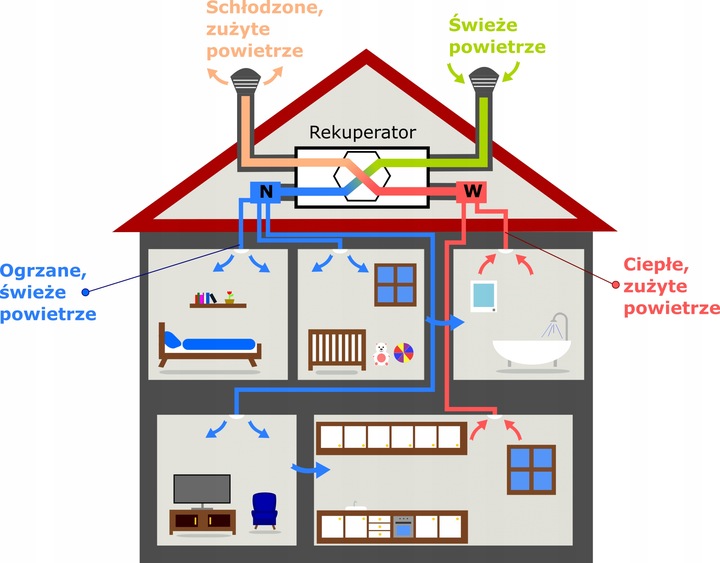 Вентиляційна установка з рекуперацією тепла, також відома як рекуператор, відповідає за рух повітря. Він втягує свіже повітря ззовні в будівлю, видаляючи забруднення завдяки встановленим фільтрам, і видаляє затхле повітря з приміщень.