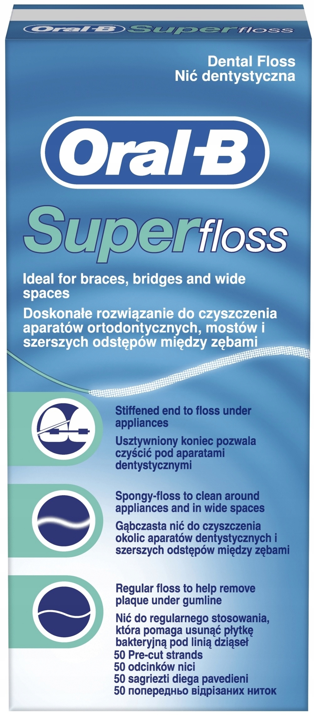 Зубна нитка Oral-B Super Floss ідеально підходить для чищення ортодонтичних брекетів, мостів і великих просторів між зубами.