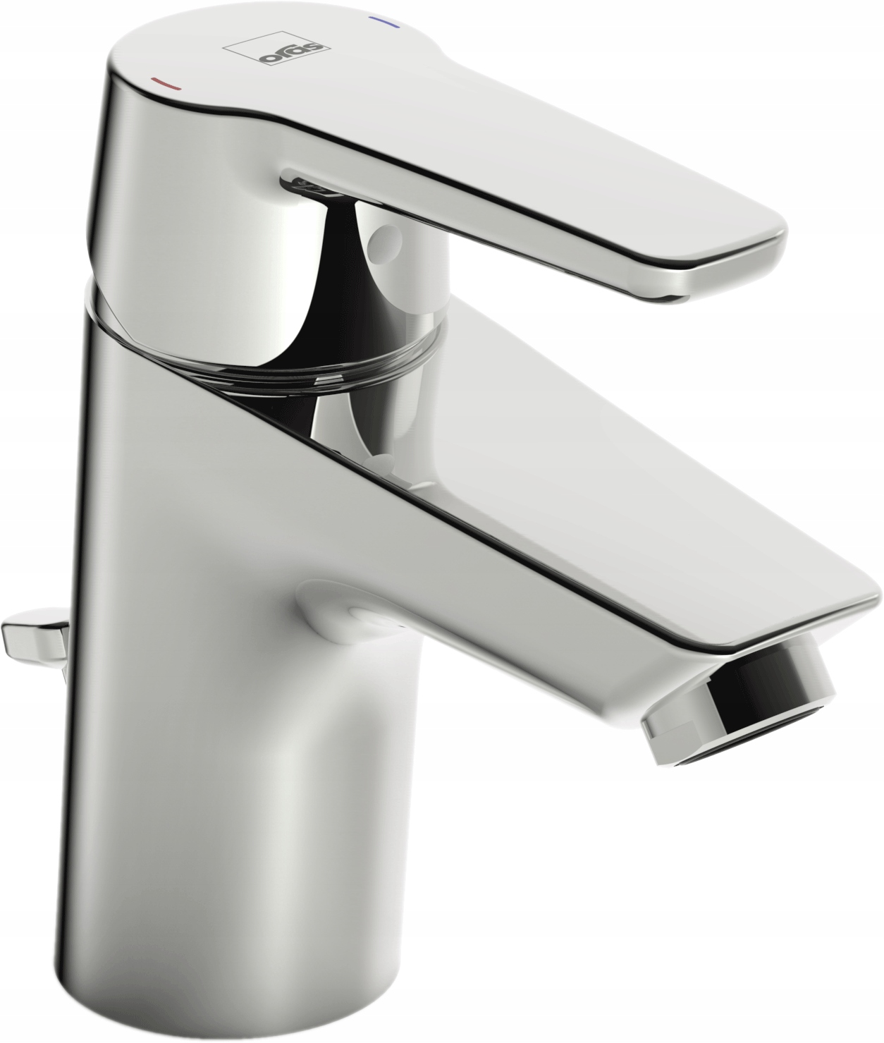 Змішувач для умивальника зі зливним клапаном, фіксованим носиком і аератором.