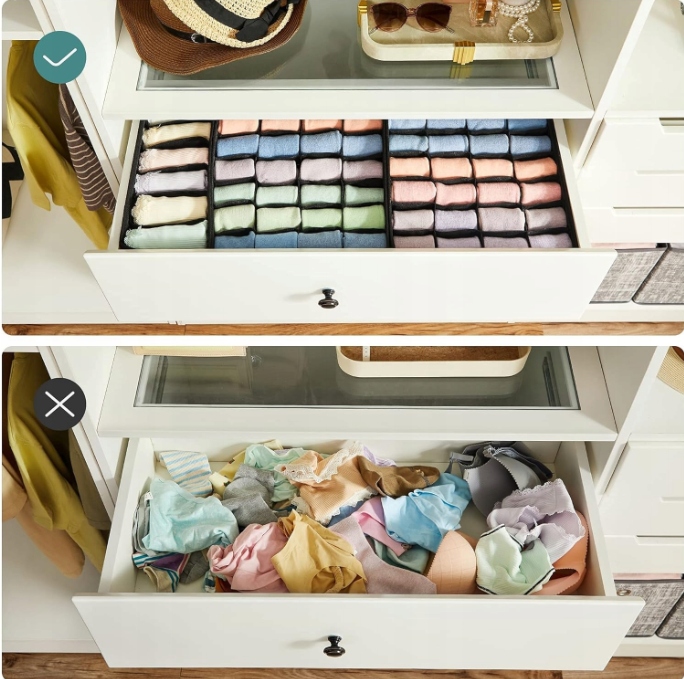 Практичний набір органайзерів для ящика або шафи для білизни - шкарпеток, бюстгальтерів, трусиків. Це дозволить вам не тільки залишатися організованим, але й швидко знаходити свої шкарпетки, нижню білизну, краватку або ремінь, що особливо корисно вранці, коли ви поспішаєте на роботу чи навчання .