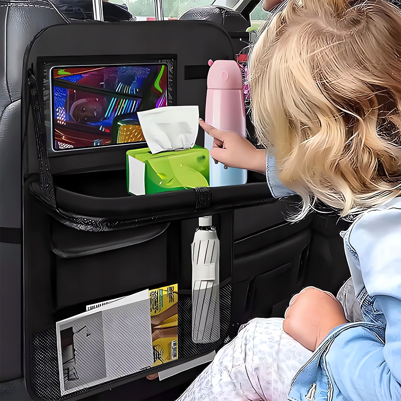 Організатор виготовлений з міцного та елегантного матеріалу , який ідеально осідає на стінах сидінь. Він є водонепроникним, довгим і не пошкоджує. Крім того, матеріал не поглинає бруд, завдяки якому ви можете легко очистити його вологою тканиною. 4 Ви вже можете розслабитися у довгу дорогу, коли вашим дітям зручно спостерігати за їхніми улюбленими казками.