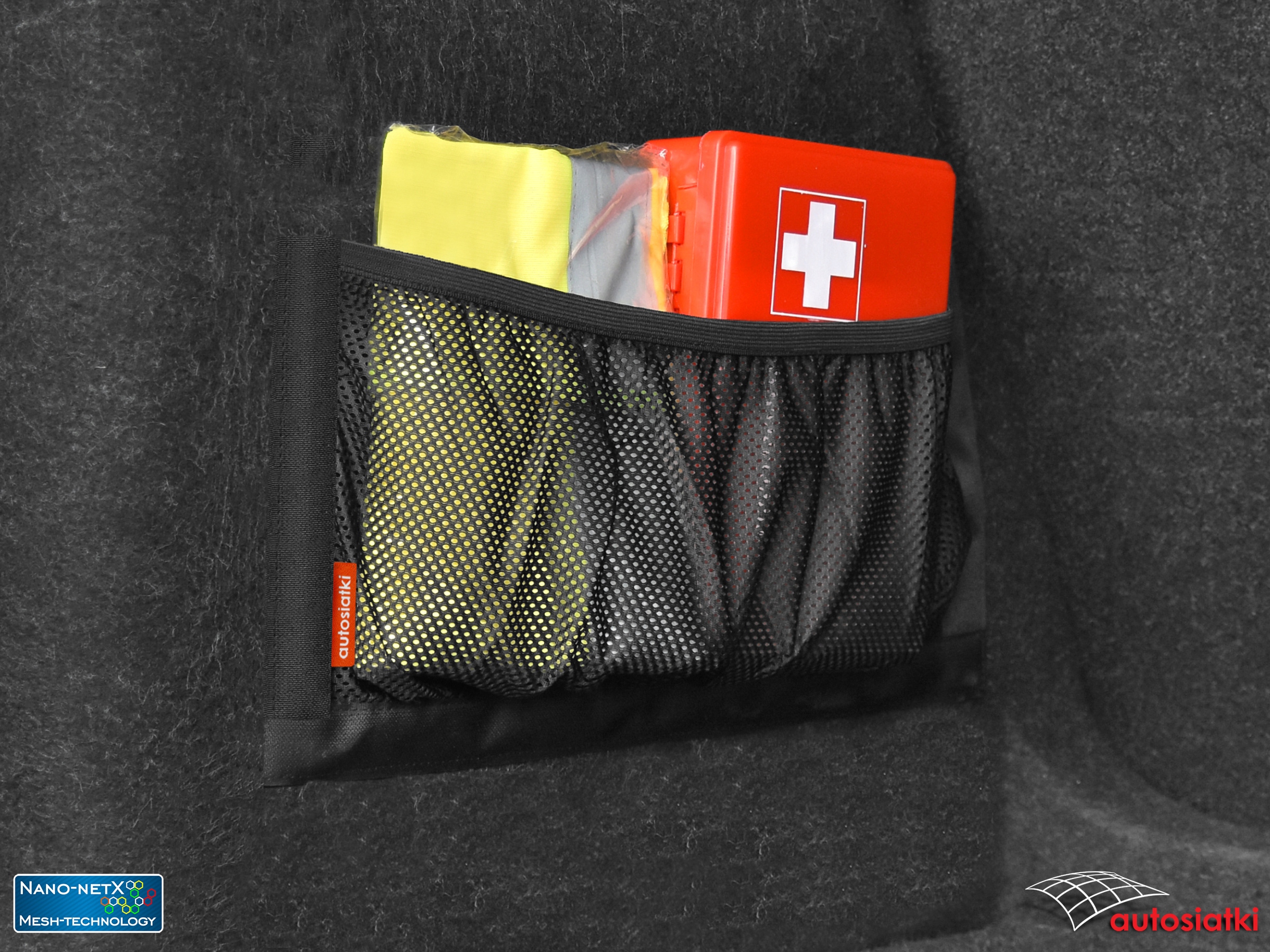 Це міцна сітка nano-netx оброблена знизу та з боків стрічкою на липучках. Зверху, закінчений гумою, яка захищає аксесуари від руху. Матеріал, що використовується сітчасті технології , захищає навіть дрібні предмети від випадання. Кишеню кріпиться до вкладиша в багажнику або автомобільній кабіні.