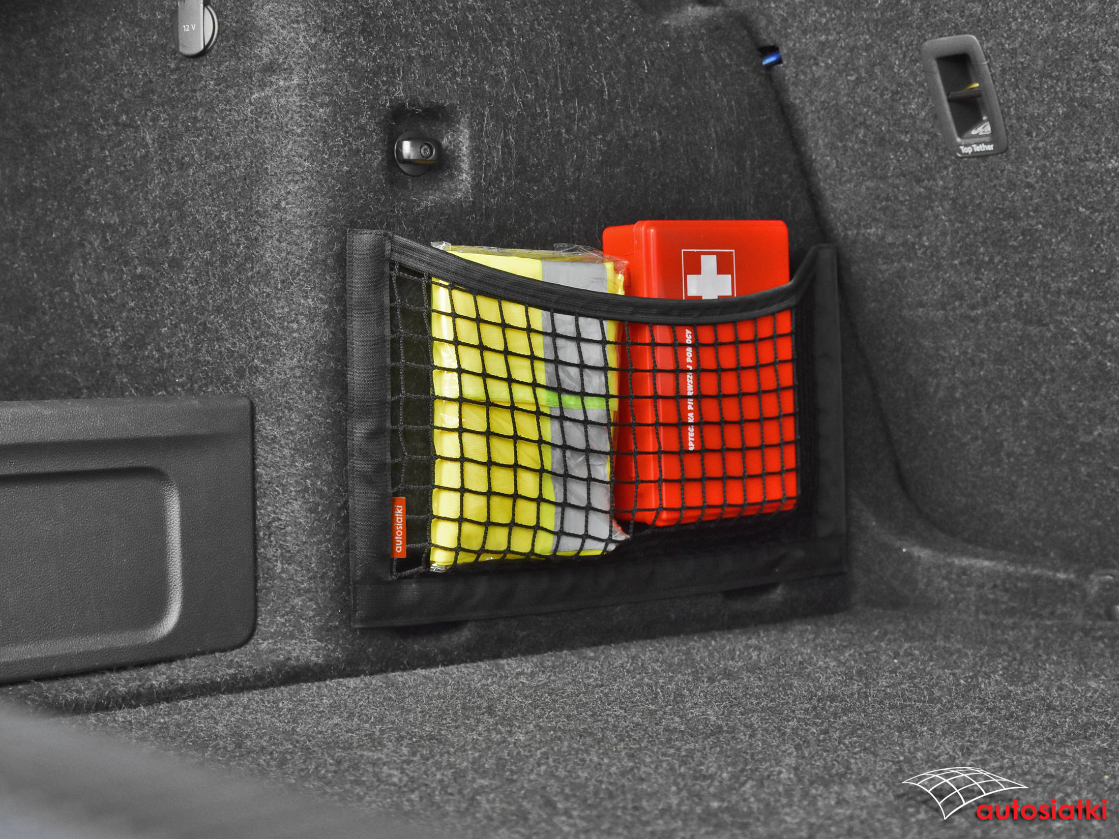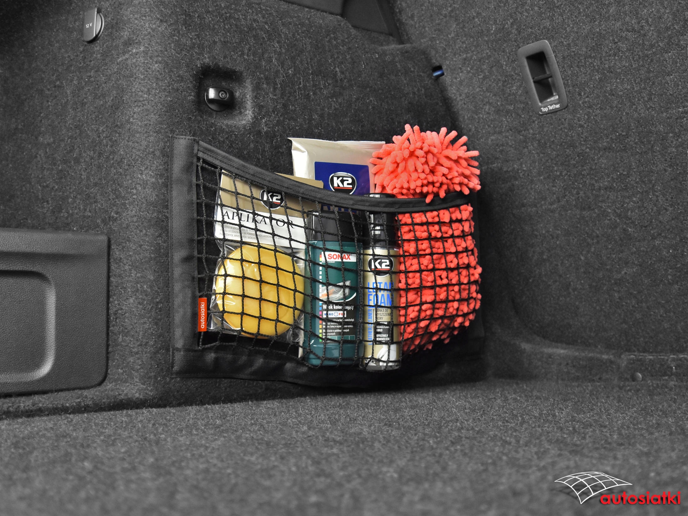 Це міцна сітка, оброблена знизу та з боків стрічкою на липучках. Зверху, закінчений гумою, яка захищає та захищає аксесуари від руху. Кишеню кріпиться до вкладиша в багажнику або автомобільній кабіні. Наприклад, липучка від куртки)